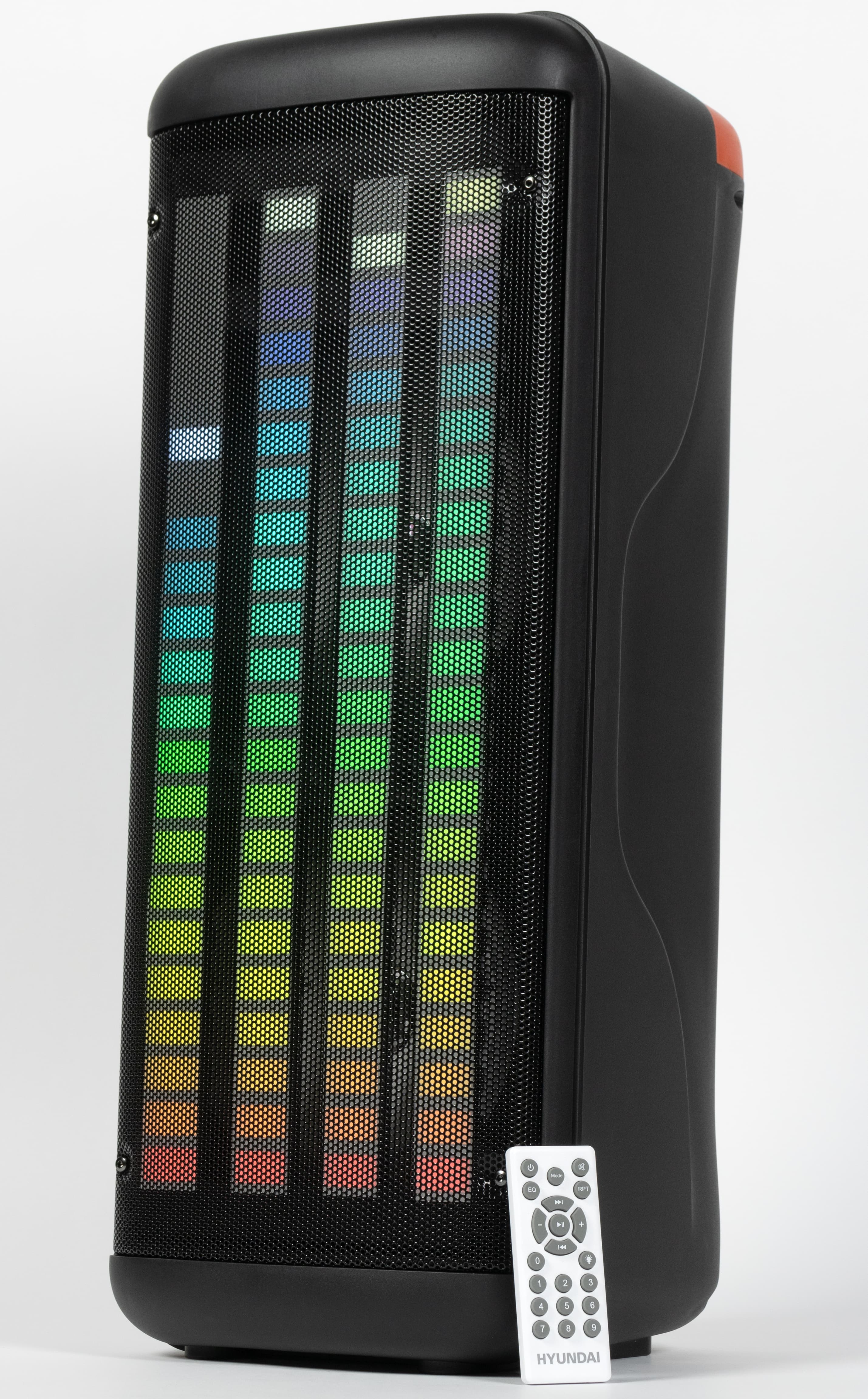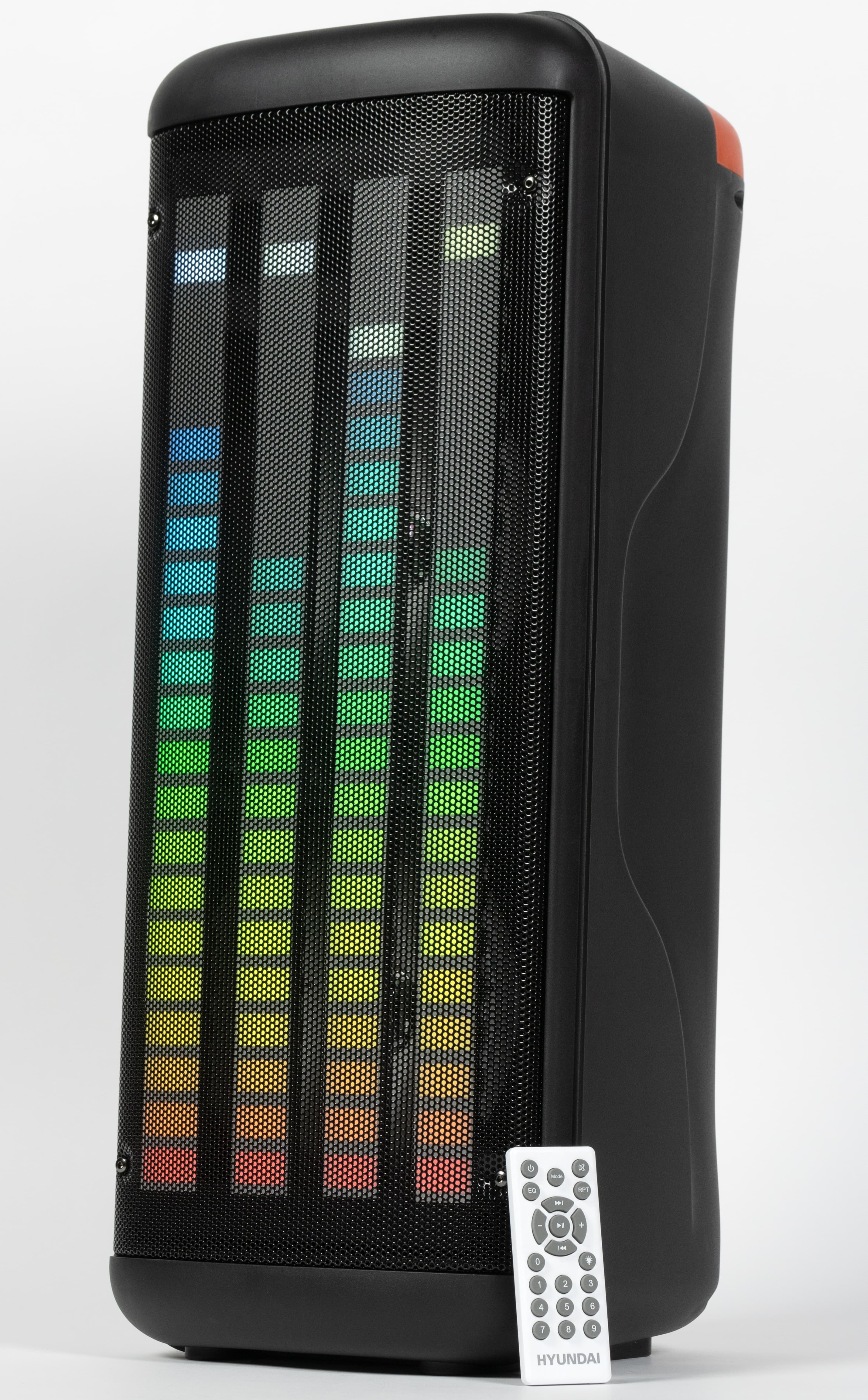 Компания Hyundai представила свою версию автономных колонок для вечеринок, которые также называют «патибоксами». Рецепт классический: пара крупных динамиков плюс твитер, автономная работа до 10 часов, подключение к источнику посредством Bluetooth и кабеля, встроенные плеер и радиоприемник, пульт дистанционного управления, вход для микрофона, позволяющего петь караоке. Отличительной чертой устройства стала эффектная подсветка в виде столбиков эквалайзера.
