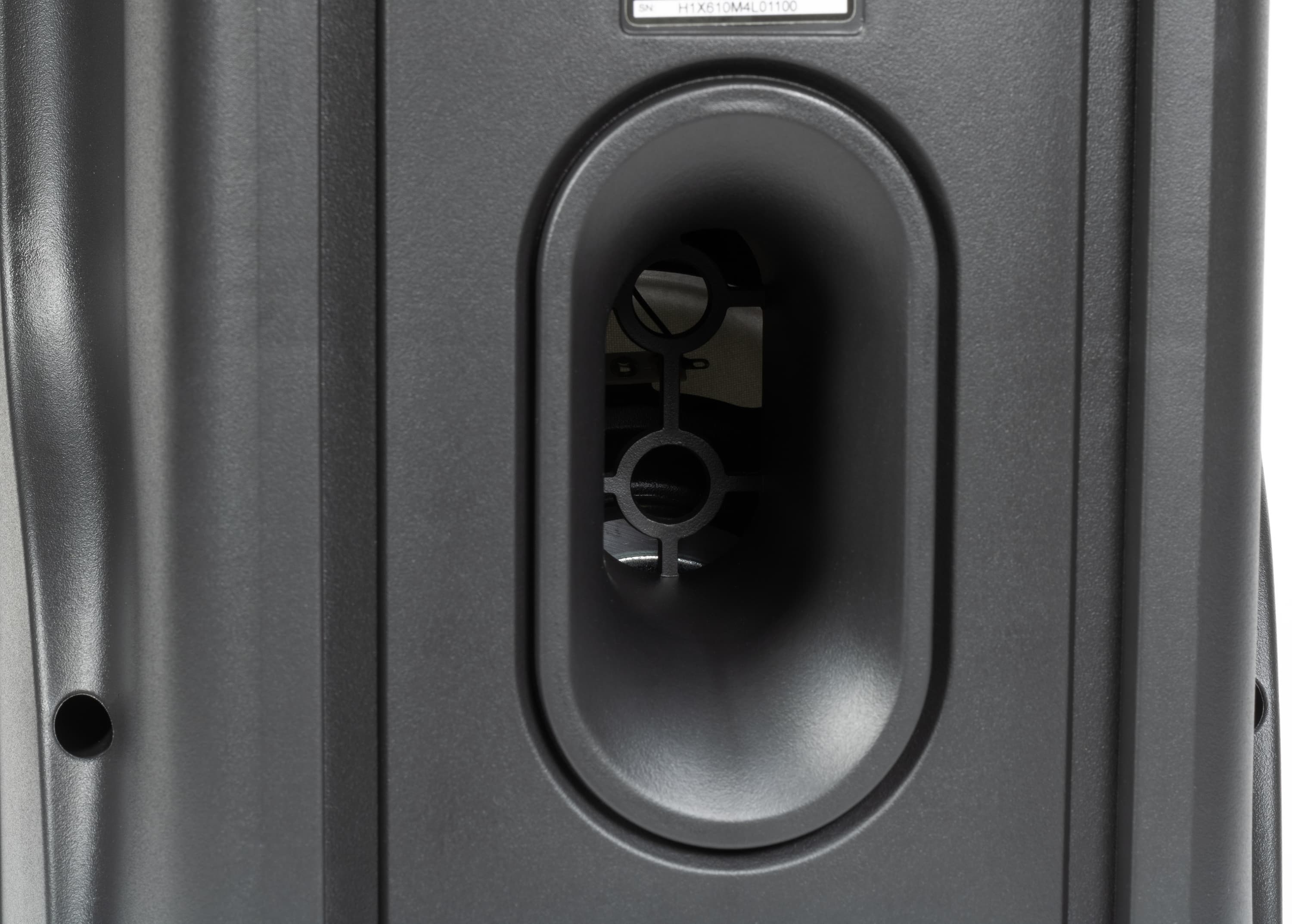 Овальный раструб фазоинвертора на задней панели закрыт изнутри пластиковой решеткой, препятствующей попаданию посторонних предметов внутрь корпуса.