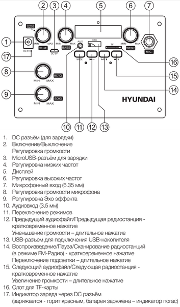 Включение патибокса осуществляется поворотом регулятора громкости. Обо всем, что с ним происходит, он оповещает с помощью голосовых сообщений на русском языке. После активации режима Bluetooth колонка некоторое время пытается соединиться с ранее подключенными устройствами, далее активирует режим сопряжения. Остается найти ее в соответствующем меню используемого в качестве источника звука гаджета и подключить. Мультипойнт Hyundai H-MC1236 не поддерживает, кодек поддерживается только один — SBC. При желании можно воспользоваться проводным подключением с помощью комплектного кабеля. Все разъемы для подключения находятся на верхней панели.