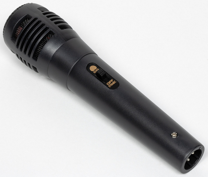 Микрофон небольшой и очень легкий, корпус выполнен из пластика. На боковой части размещен выключатель, позволяющий легко отключить звук микрофона, не подходя к колонке.