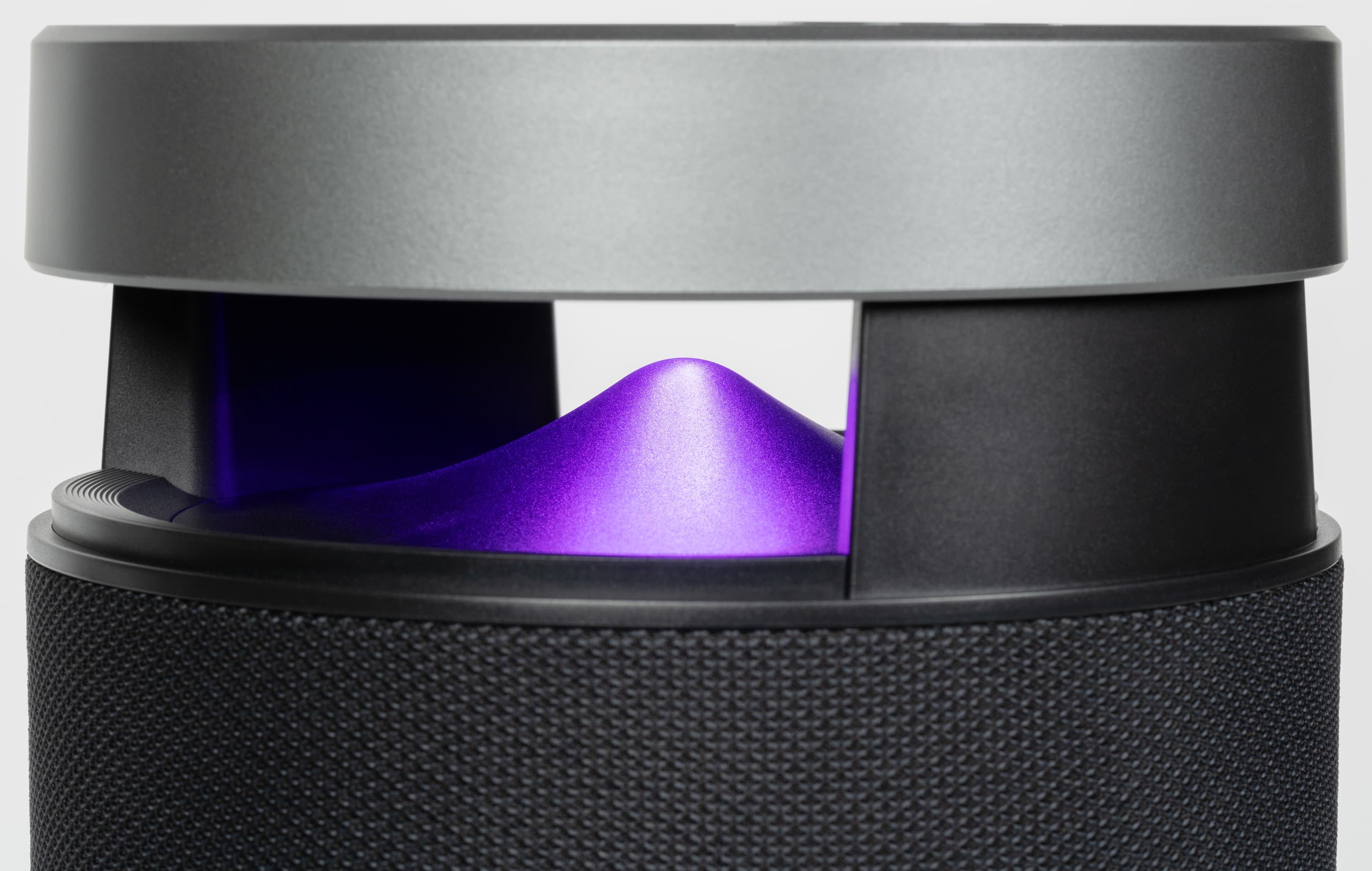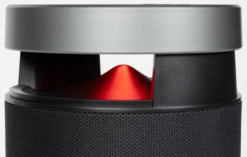 Сходным образом подсветка организована и в нижней части корпуса. Основание с крупными прорезями приподнимает колонку над поверхностью, обеспечивая эффективную работу басового динамика диаметром 5,35 дюйма, размещенного в нижнем торце и направленного вниз. В центре основания также находится конусообразный рассеиватель, который подсвечивается сверху.