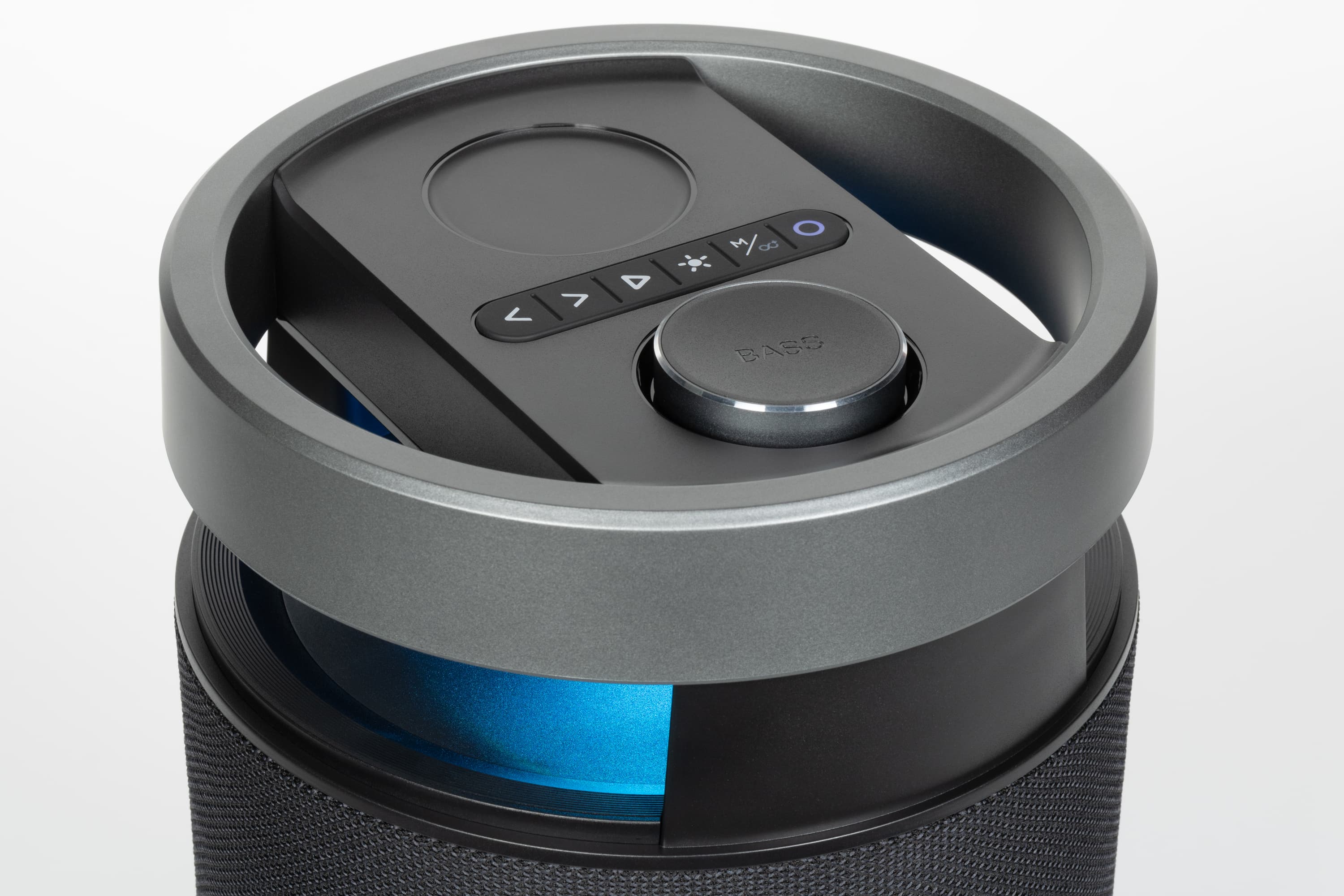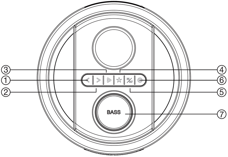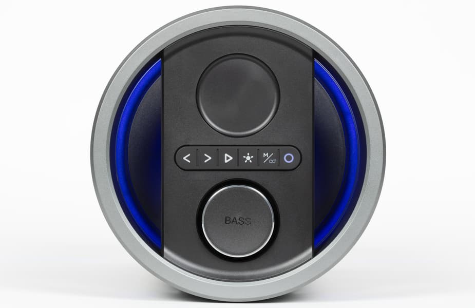 На верхней панели колонки находится несколько клавиш, прикрытых сегментированной резиновой накладкой, обеспечивающей защиту от воды. Ниже расположен крупный поворотный регулятор. На нем написано Bass, так как при нажатии он переключает режимы эквалайзера, однако в режиме по умолчанию он используется для изменения громкости колонки. Также его можно переключить на регулировку громкости микрофона или глубины эффекта эхо.