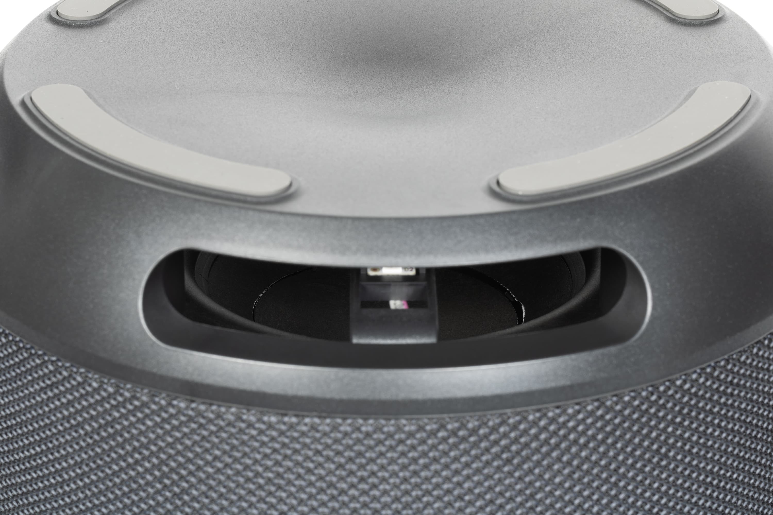 Заглянув в отверстие нижнего элемента, можно увидеть диффузор басового излучателя и светодиоды динамической подсветки.