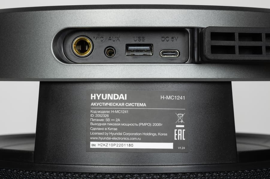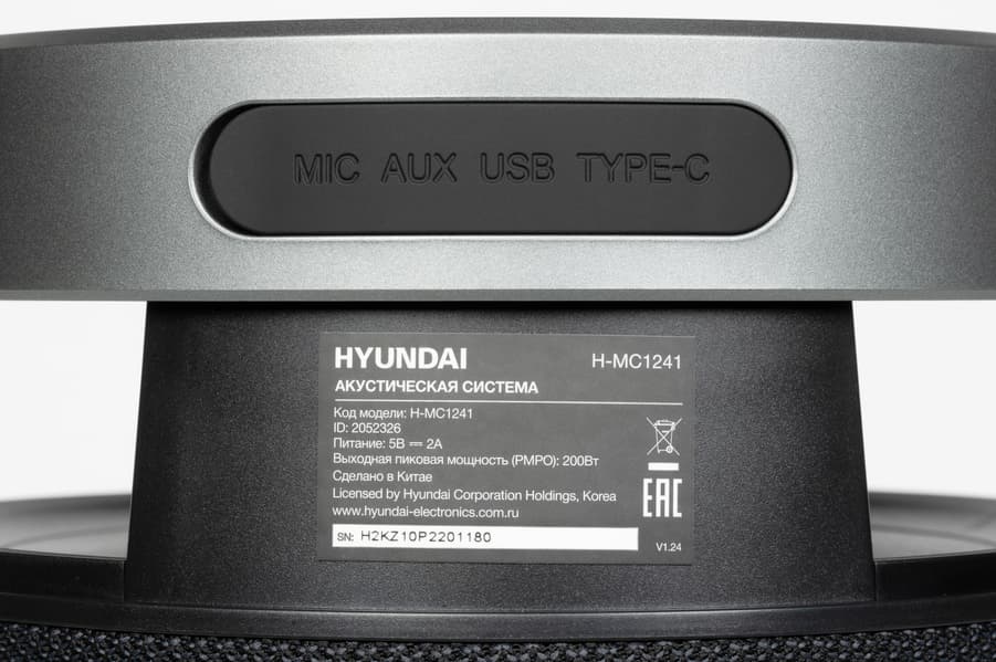 При включении Hyundai Select H-MC1241 воспроизводит голосовое сообщение о подаче питания, а также озвучивает активный вход. Уведомляет она и о других действиях — переключении режимов, подключении устройств и так далее. При необходимости голосовые оповещения можно отключить. Колонка поддерживает кодек SBC — базовое решение, но для портативной акустики его возможностей достаточно.