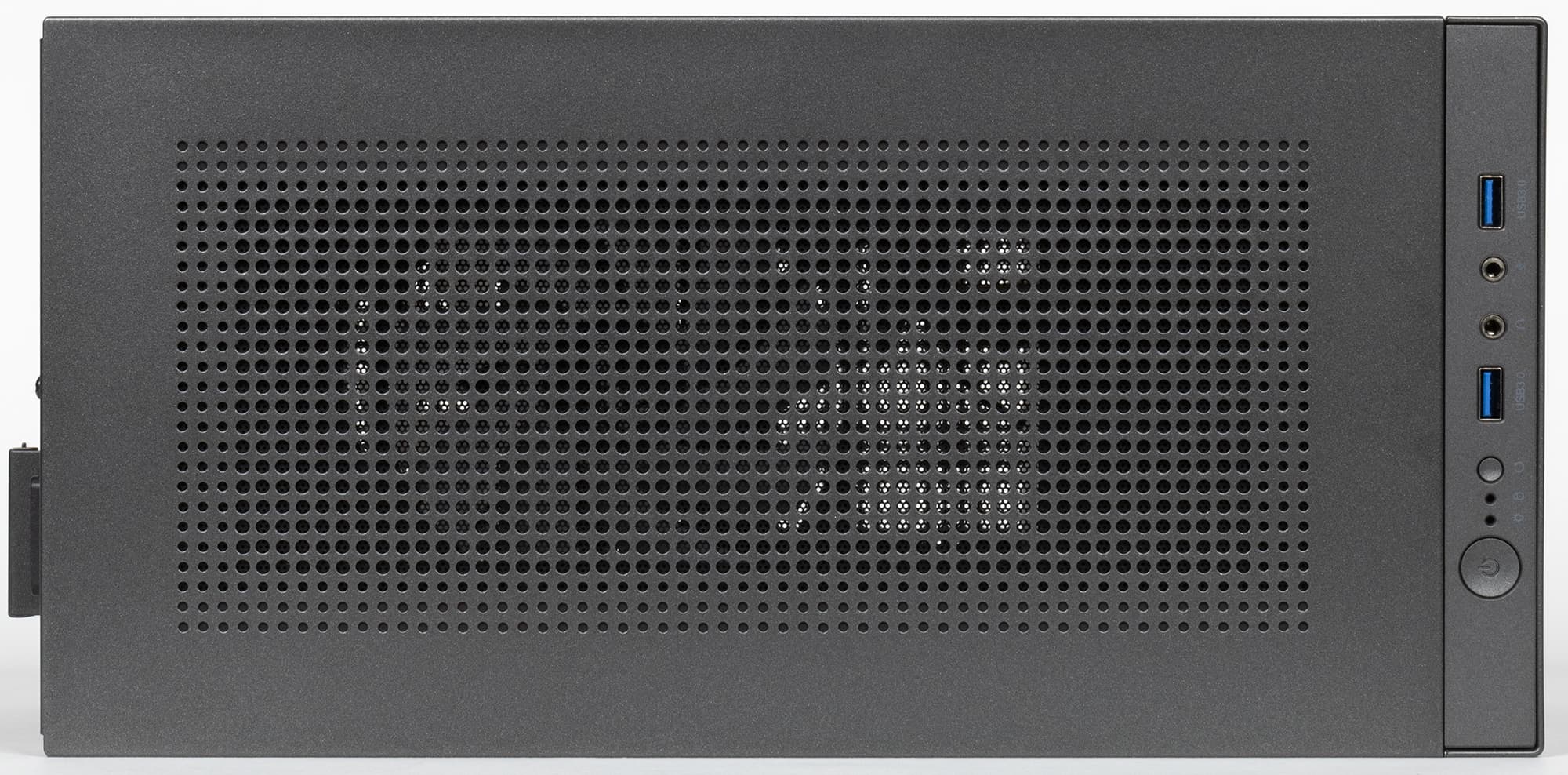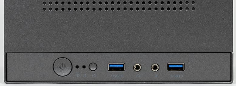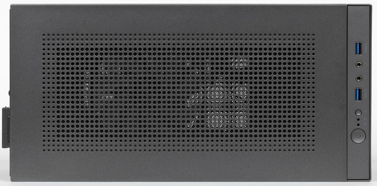 Панель управления находится в передней части верхней плоскости, что с учётом небольшой высоты корпуса делает доступ к её органам удобным при любом варианте размещения, напольном или настольном. На ней расположены (слева направо): большая кнопка Power, два светодиодных индикатора – включения и дисковой активности, кнопка Reset, разъём USB3 Type-A, пара аудиогнёзд и ещё один разъём USB3 Type-A. Кнопка питания имеет небольшой свободный ход и заметное усилие нажатия, поэтому срабатывание от случайного прикосновения будет маловероятным; ну, а Reset совсем маленькая, нажимать её надо чем-нибудь с острым кончиком.
