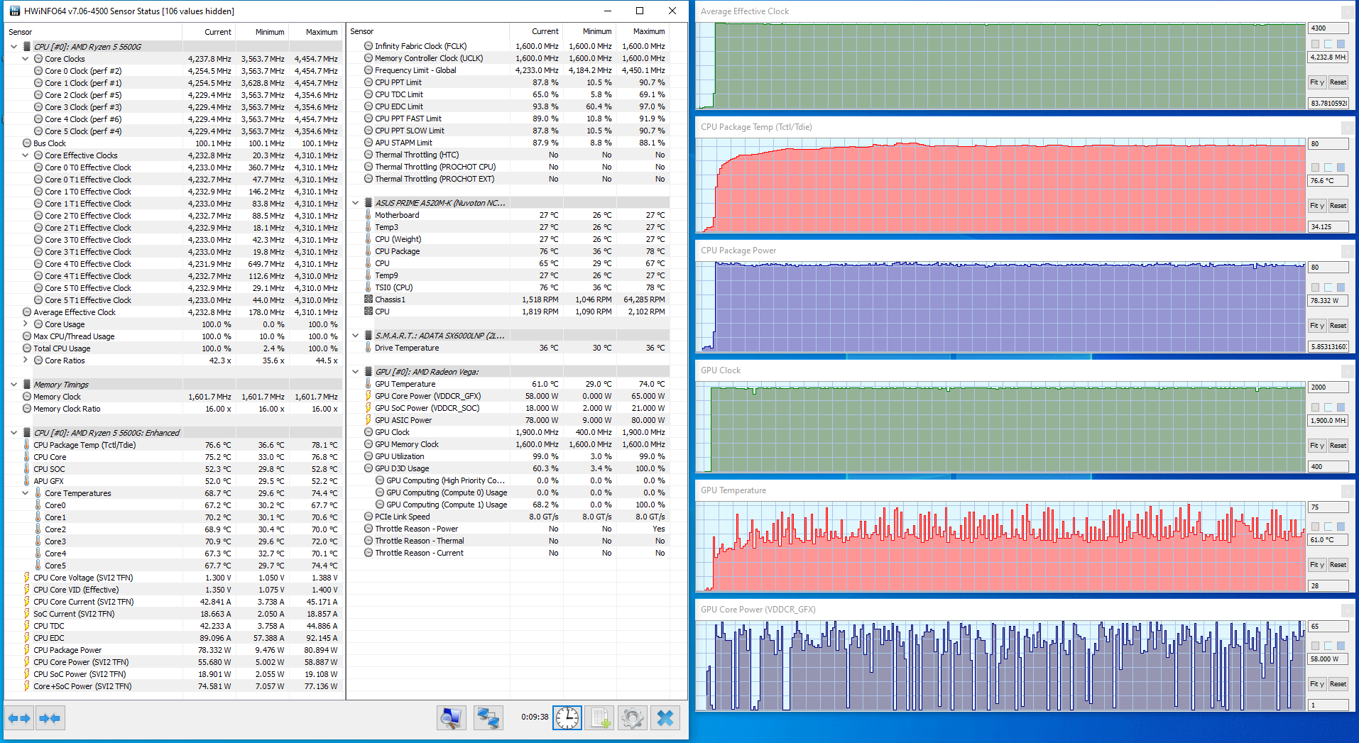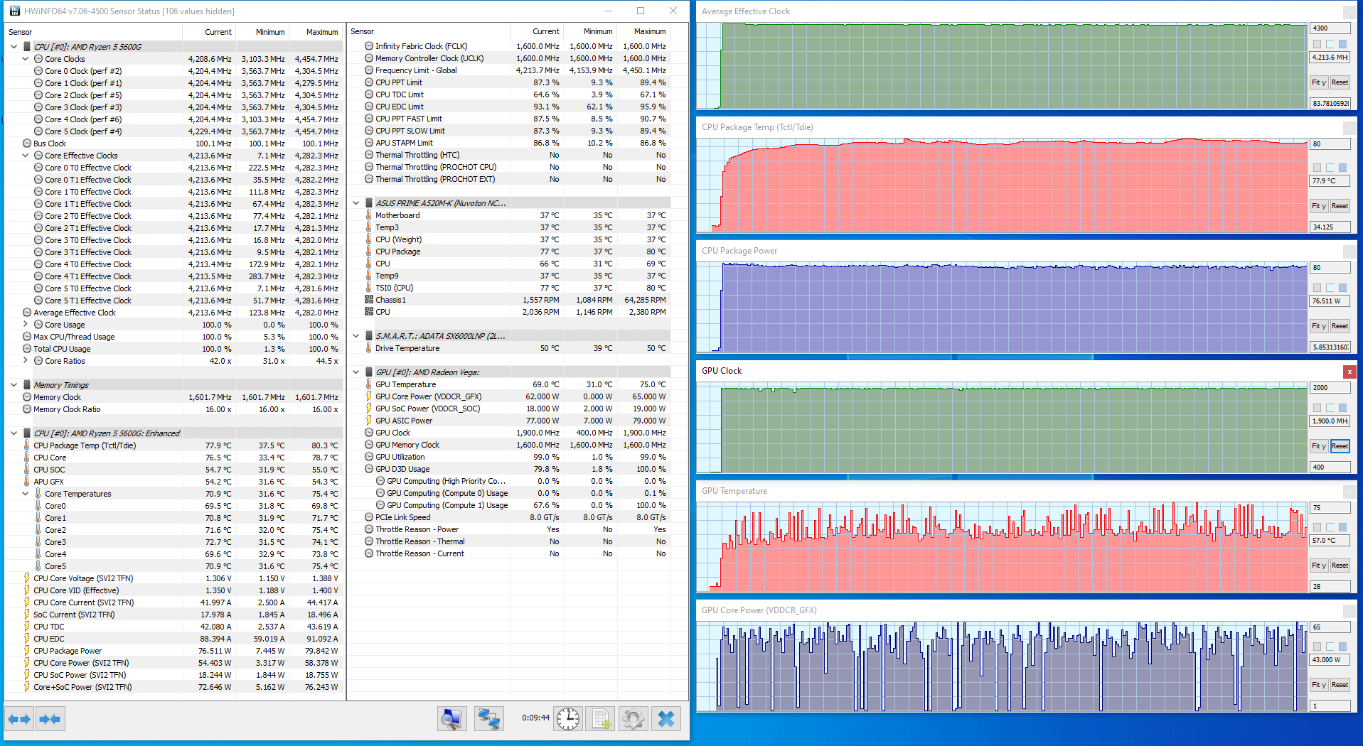 В этом тесте CPU работает на более высокой частоте (4,2-4,3 ГГц), его потребление приближается к 78-79 ваттам, что уже заметно выше заявленного TDP, соответственно повышается и температура (до 80 °C, но и это вовсе не перегрев), а скорость вращения обоих вентиляторов возрастает до 1500-1600 об/мин у корпусного и 2200-2300 об/мин у процессорного (и это заметно на слух).