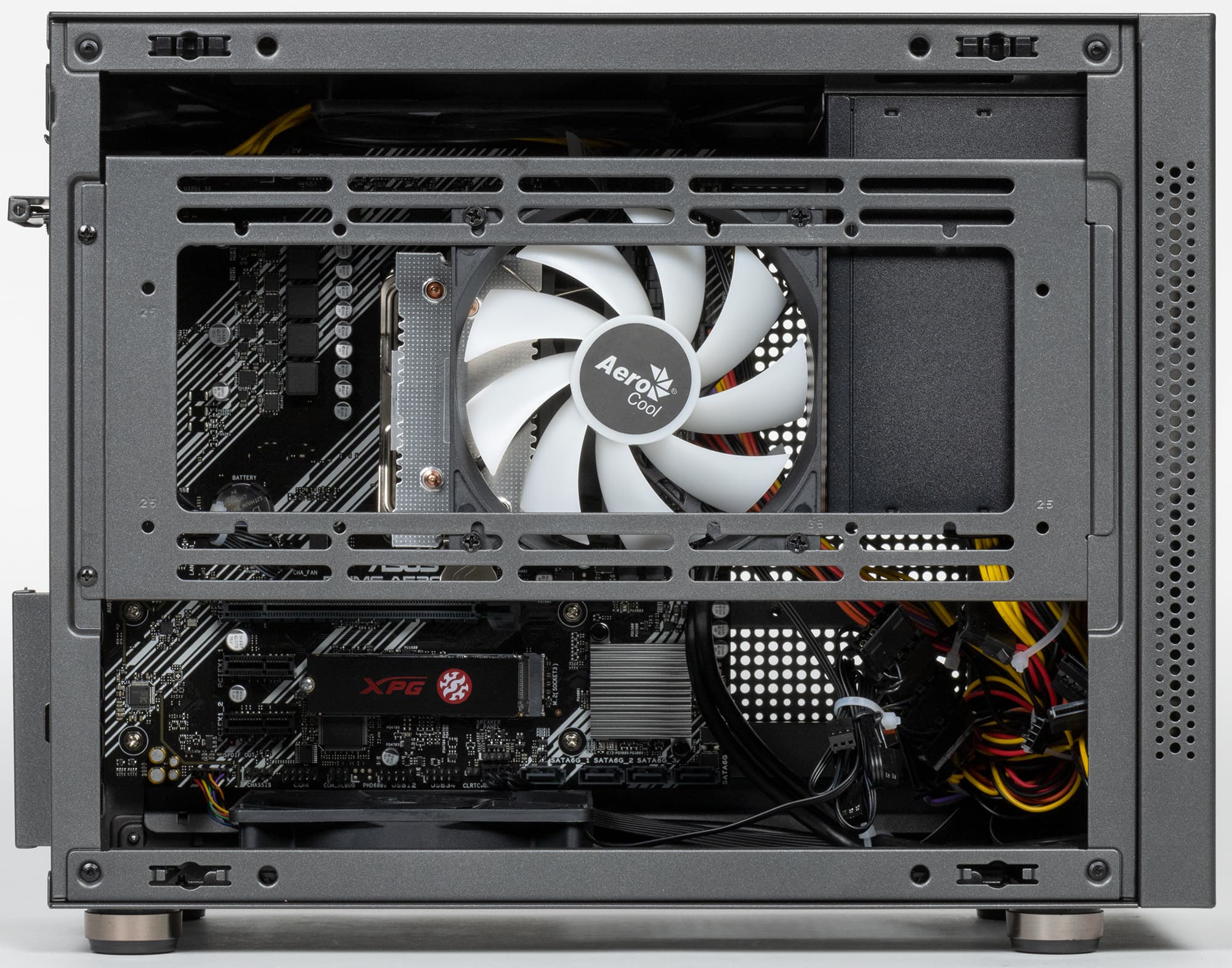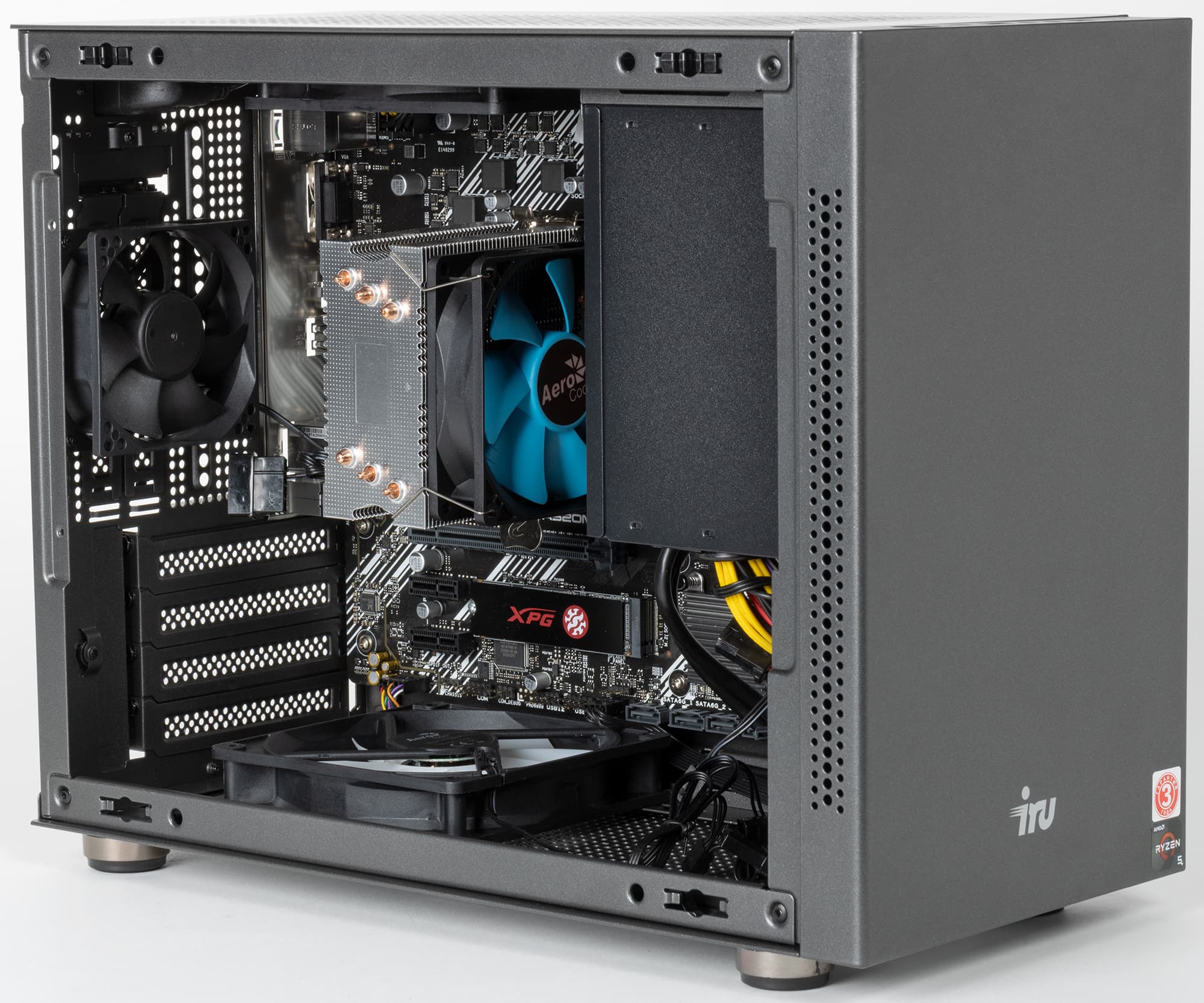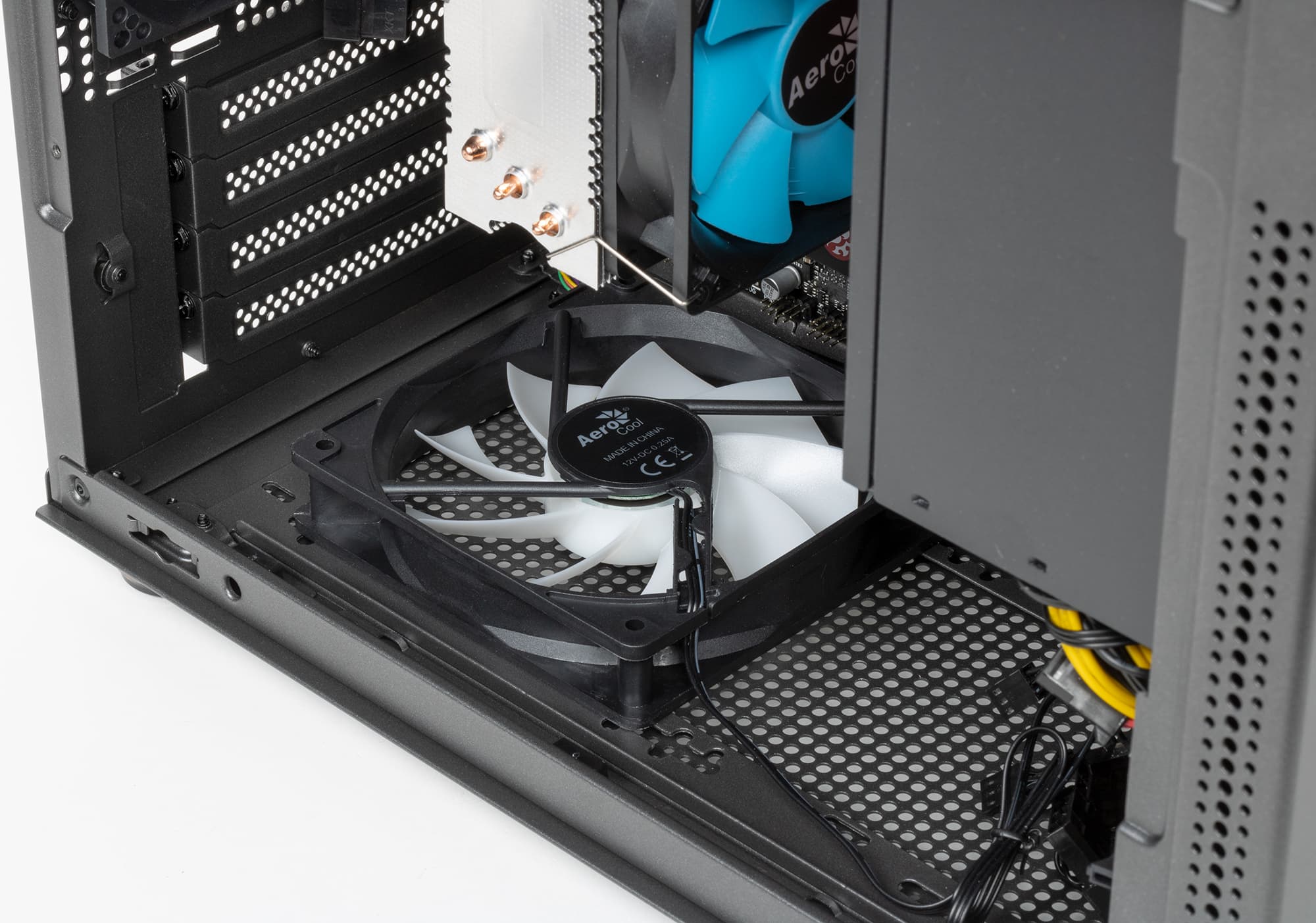 Дополнительно установлены ещё три 12-сантиметровых вентилятора производства Aerocool на левой, верхней и нижней плоскостях шасси. Есть существенный запас мощности на перспективу.