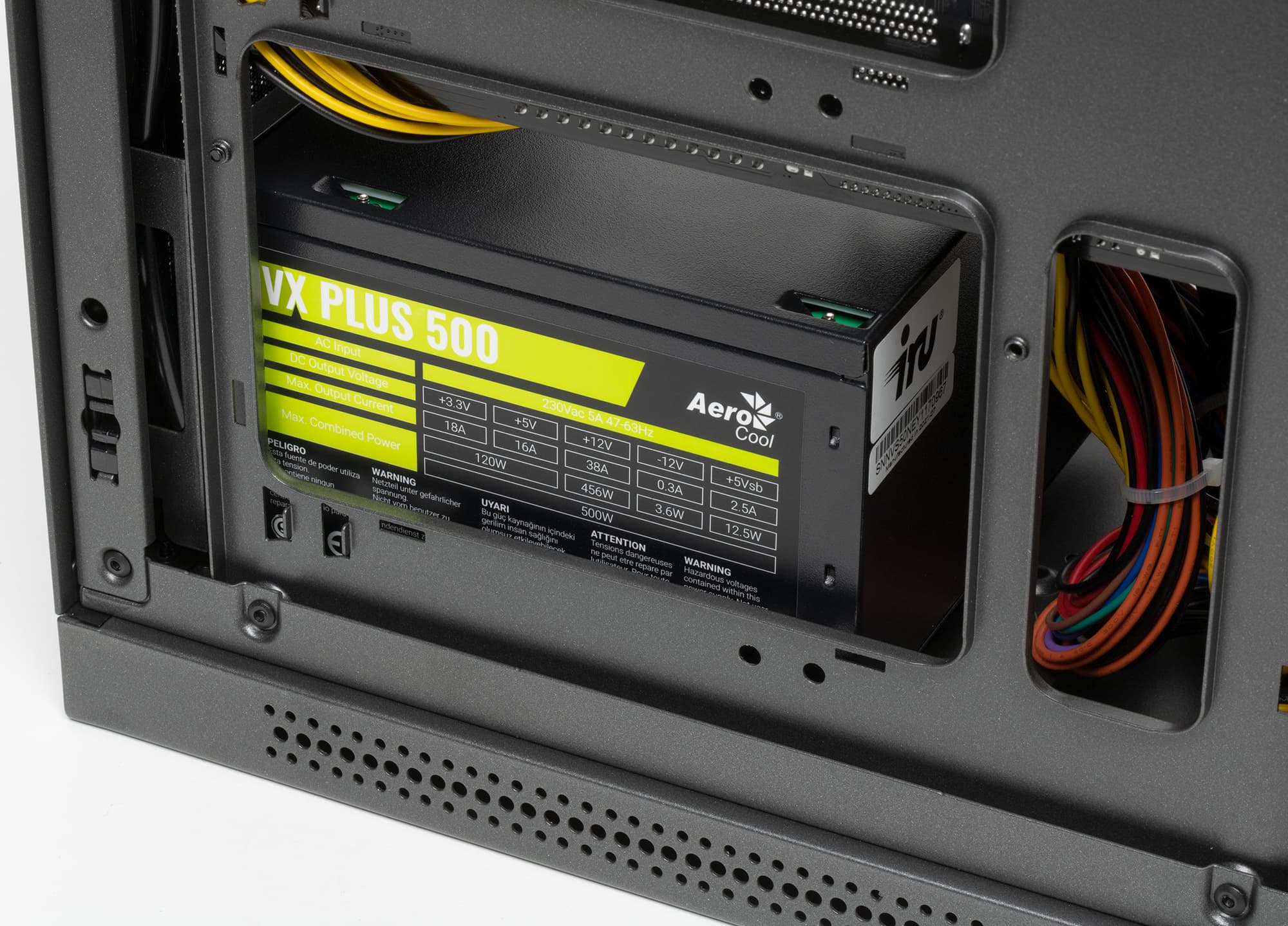 В качестве источника питания использован Aerocool VX Plus 500 (цифры обозначают мощность в ваттах; еcть активный PFC), который относится к бюджетным моделям и часто используется сборщиками ПК. Он размещён вертикально в передней части корпуса таким образом, что встроенный в него нагнетающий вентилятор обращён к лицевой панели, а выброс прошедшего через "потроха" БП воздуха направлен вверх. Разъём корпуса ПК для подключения к сети переменного тока расположен стандартно, на задней стенке, и с блоком питания он соединяется специальным кабелем, аккуратно проложенным в верхней части шасси.