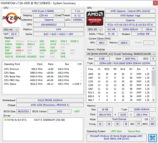 Параметры используемого в компьютере процессора AMD Ryzen 5 5600G приведены в начале материала, дополнительно приведём скриншот утилиты HWiNFO64: