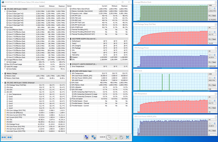 Контролируемые вентиляторы почти не меняют скорость вращения, тактовая частота CPU в среднем колеблется вокруг значения 3,3 ГГц, потребление не превышает 44 Вт, а температура не поднимается выше 54 °C, то есть до перегрева очень и очень далеко.