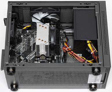 Установка дополнительных SSD или HDD также предусмотрена. Так, отверстия для крепления двух 2,5-дюймовых накопителей имеются в нижней половине фронтальной плоскости шасси, под блоком питания, при этом сам накопитель устанавливается вертикально изнутри, а винты закручиваются снаружи. И если с доступом к этим винтам проблем нет, то места, предназначенные для накопителей, заняты изрядным пучком выходящих из БП проводов. Конечно, трудности не имеют принципиального характера и вполне преодолимы, но немного попыхтеть всё же придётся.