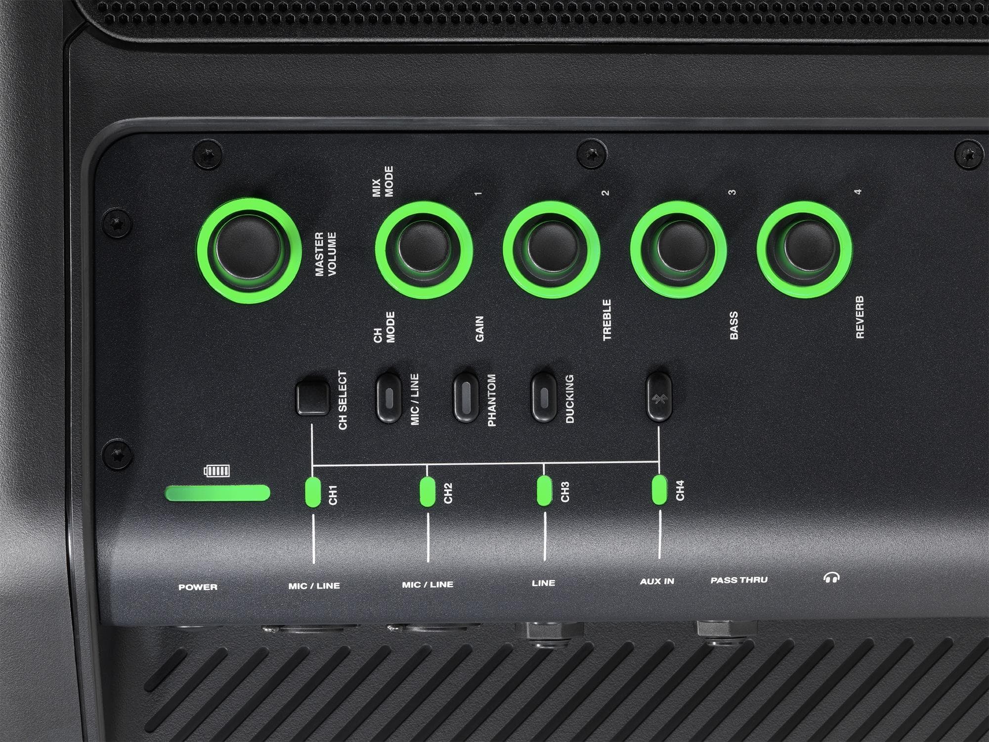 К колонке можно подключить до четырех источников звука как с помощью кабелей, так и по Bluetooth. В JBL EON ONE Compact уже встроен микшерный пульт, который поддерживает алгоритмы обработки сигнала Lexicon и dbx. Сигнал от микрофонов можно подавать на первые два канала через XLR/TRS-разъемы. Причем на первый вход можно подать также и фантомное питание 48 В. На третий канал сигнал поступает через Hi-Z вход с TRS-разъемом. Четвертый канал используется для подключения внешних источников звука через AUX или Bluetooth.