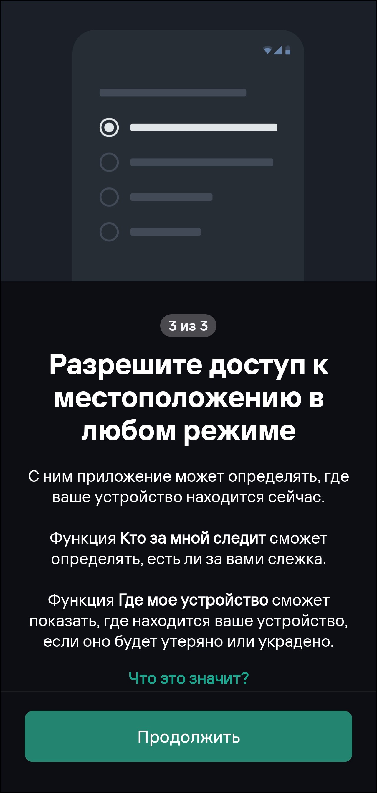 Функция защиты от слежки требует доступа к местоположению и устройствам поблизости – без этого она по понятным причинам работать не будет, так как речь идет в том числе об уведомлениях о подброшенных Bluetooth-устройствах, например, беспроводных метках. Такие девайсы могут применяться недоброжелателями, чтобы наблюдать за перемещениями человека. Даем разрешение – получаем возможность отслеживать сталкерские приложения на смартфоне, предотвращать слежку с помощью периферийных устройств.