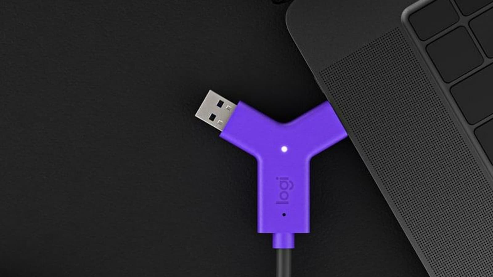 В комплекте Swytch есть 5-метровый USB-кабель для соединения между собой его двух основных частей: хаба и экстендера. Производитель также поставляет провод USB-C — USB-A, небольшой кабель HDMI и, собственно, основной кабель с фиолетовым разветвленным блоком на конце. Его все и представляют в первую очередь, когда речь заходит о Logitech Swytch.