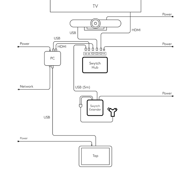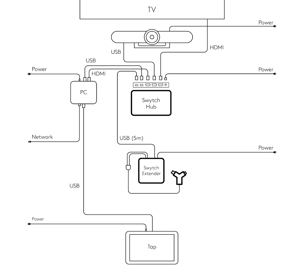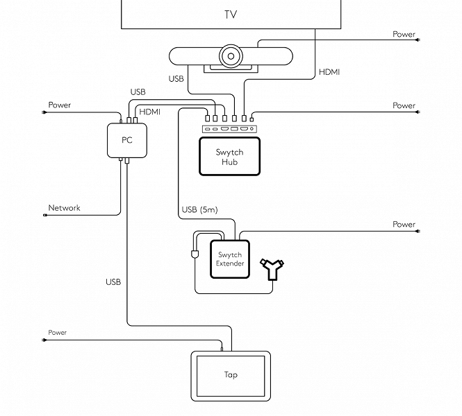 Swytch Hub размещается неподалеку от основного дисплея в переговорке. У него есть собственное питание, а также набор портов: HDMI, USB-C для связи к компьютером. Со Swytch Extender этот блок соединяется по USB. Комплектный кабель позволяет разнести их на расстояние до пяти метров, но поддерживаются и более длинные шнуры — до 25 м.