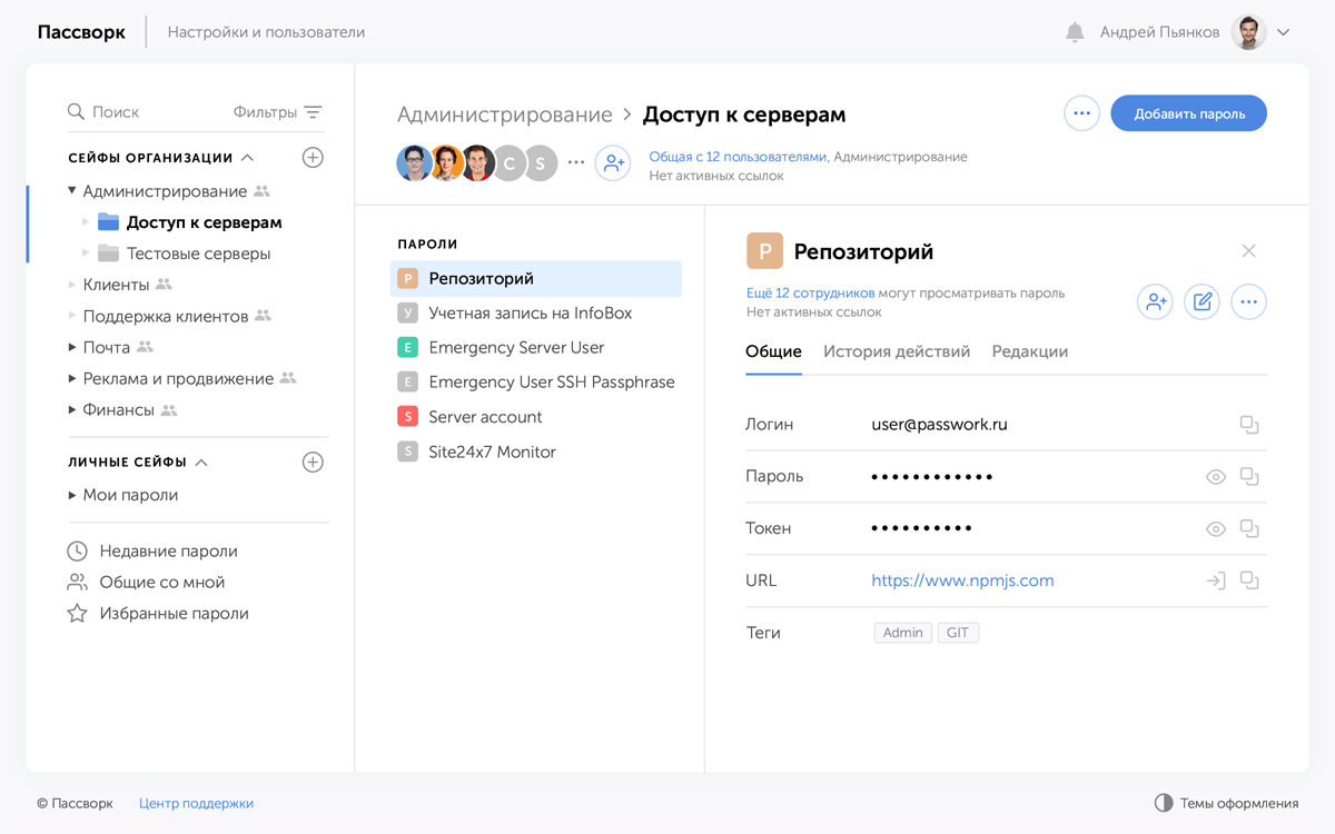Сисадмины часто хранят пароли компании в «Кипасе», иногда в «Гугл таблицах». Чтобы делиться этими паролями или работать совместно — таблицу расшаривают, а файл с базой «Кипаса» хранят в общей папке на «Дропбоксе». Это не самые удобные способы — сложно проводить аудит, отслеживать действия, разграничивать права. Для таких задач лучше подходит специализированное решение — менеджер паролей Пассворк.