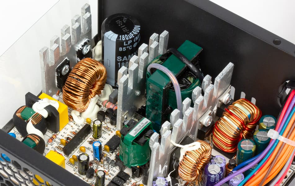 Фильтр электромагнитных помех на входе питания состоит из двух конденсаторов CX (один на входе шнура питания), четырех конденсаторов CY (два на входе шнура питания) и трех синфазных дросселей.