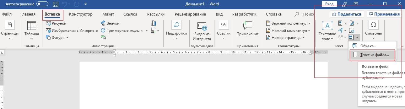 - Далее заходим в подменю Текст (Text) появятся команды «Объект» (или Insert Object) и Текст из файла (или Text from file)