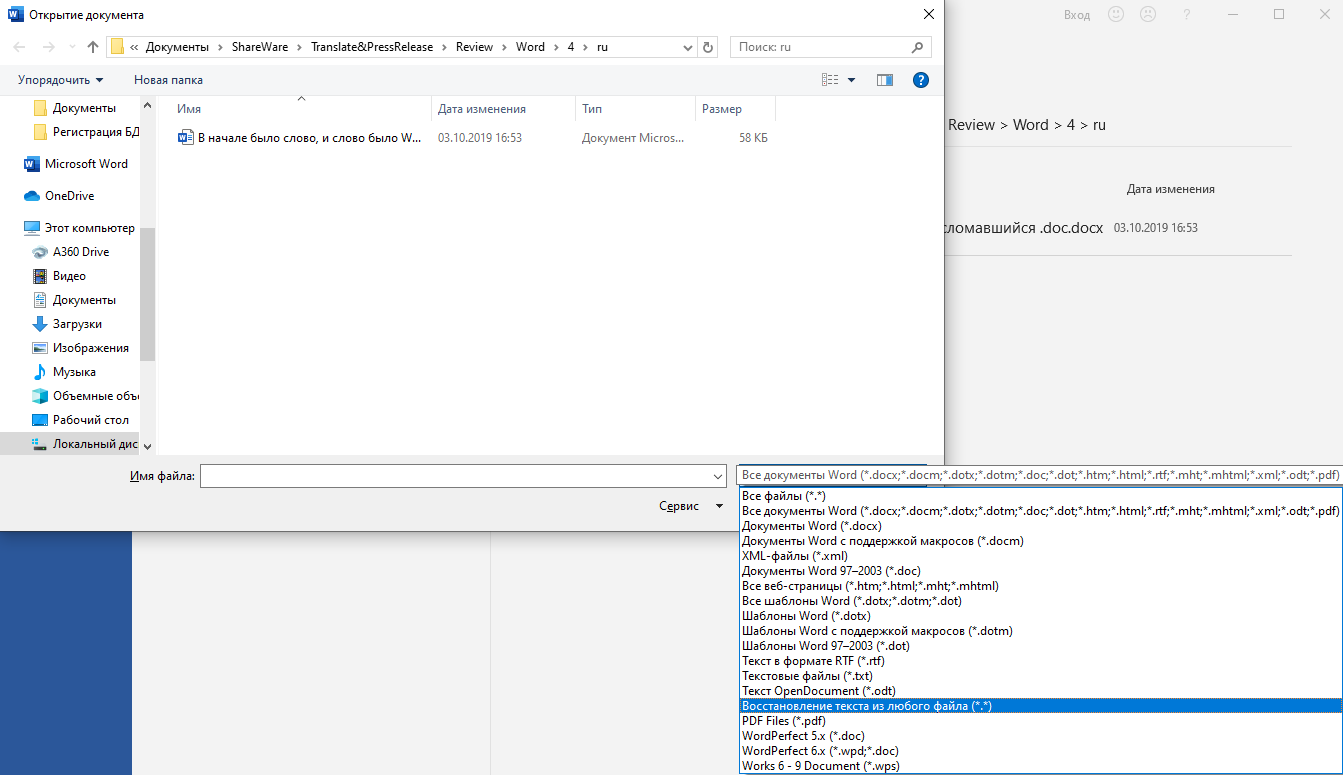 Чтобы получить доступ к штатному инструменту, нужно запустить Word, затем перейти «Файл» (File) – «Открыть» (Open). В диалоговом окне нужно выбрать проблемный документ, а затем нажать на кнопку «Тип файлов» и выбрать из списка Recover Text from Any File.