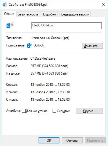 - Нажмите «Сохранить» («Save»). Это сохранит PST файл и откроет конечную папку, в которой был сохранен файл. Щелкните правой кнопкой мыши на PST файле и выберите свойства, чтобы проверить окончательный формат файла. Как вы можете видеть на скриншоте ниже, сохраненный файл теперь является PST файлом Microsoft Outlook.