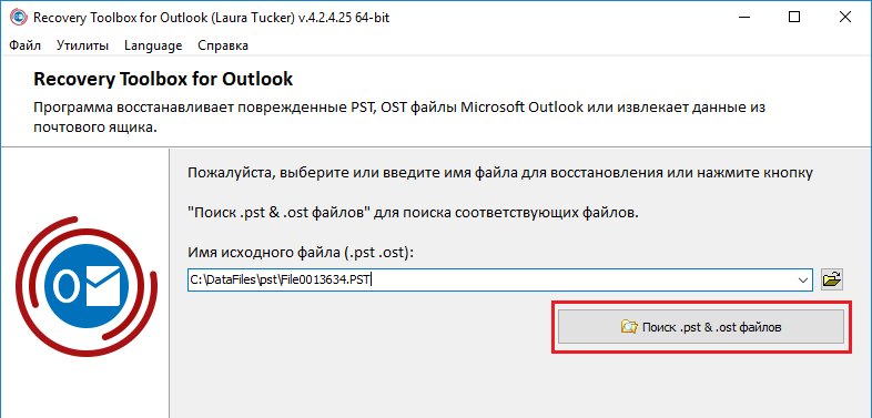 - Нажмите кнопку «Поиск .pst и .ost файлов» («Search for .pst & .ost files»), чтобы выбрать .pst файл Microsoft Outlook на диске.