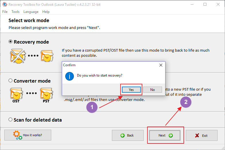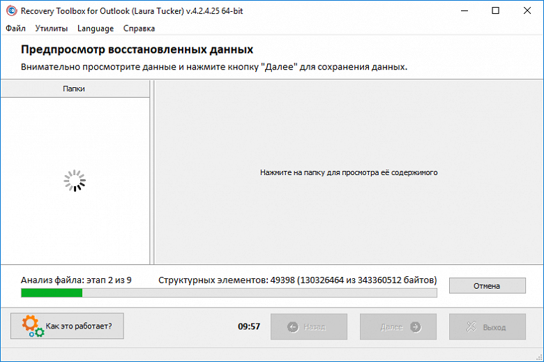 Восстановление данных с помощью Recovery Toolbox for Outlook включает три этапа:
