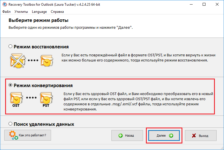 Вот как конвертировать OST файл в PST. Процедура такая же, как описанная выше, различие только в том, что на этот раз мы будем использовать «Режим конвертера» («Converter mode»), а не «Режим восстановления» («Recovery mode») на этапе 5, который мы использовали ранее.