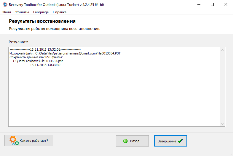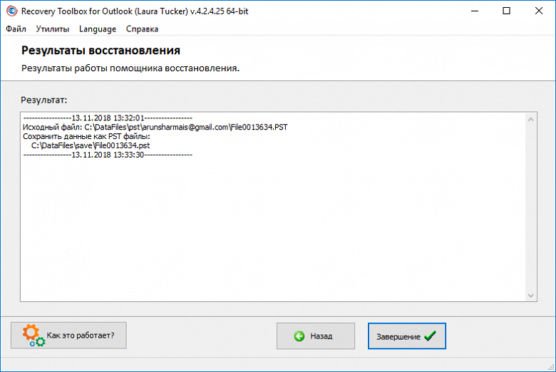 - Вот и все! Вы успешно восстановили данные из поврежденного файла PST. На последней странице будет отображен журнал процесса восстановления.