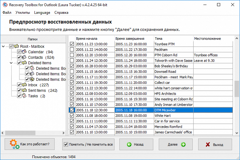 - Затем инструмент отобразит данные, возможные к восстановлению. Для анализа всего файла утилите потребовалось ровно шестнадцать минут. Если вы нажмете на любую из папок слева, он справа откроется список всех объектов, которые будут восстановлены в этой папке. Я нажал на папку «Календарь», и инструмент отобразил в общей сложности девяносто четыре элемента календаря, которые будут в итоге восстановлены.