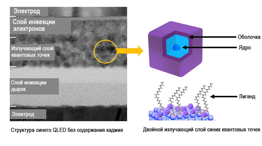 Квантовые точки состоят из базовой структуры, имеющей в свою очередь ядро, оболочку и несколько лигандов. Ядро поглощает и повторно излучает свет, а слой оболочки, окружающий сердцевину квантовой точки, увеличивает ее срок службы и повышает эффективность фотолюминесценции, предотвращая повреждения, связанные с температурой и влажностью. Имеющие форму разветвлений, лиганды расположены на поверхности оболочки квантовой точки и помогают поддерживать расстояние между частицами. Чтобы обеспечить лучшую стабильность материалов квантовых точек, добиться хорошего квантового выхода и увеличить срок службы светодиодов, исследователи применили структуру с двойными излучающими слоями квантовых точек и более короткими лигандами на поверхности синих светодиодов, одновременно с этим увеличив скорость инжекции тока.
