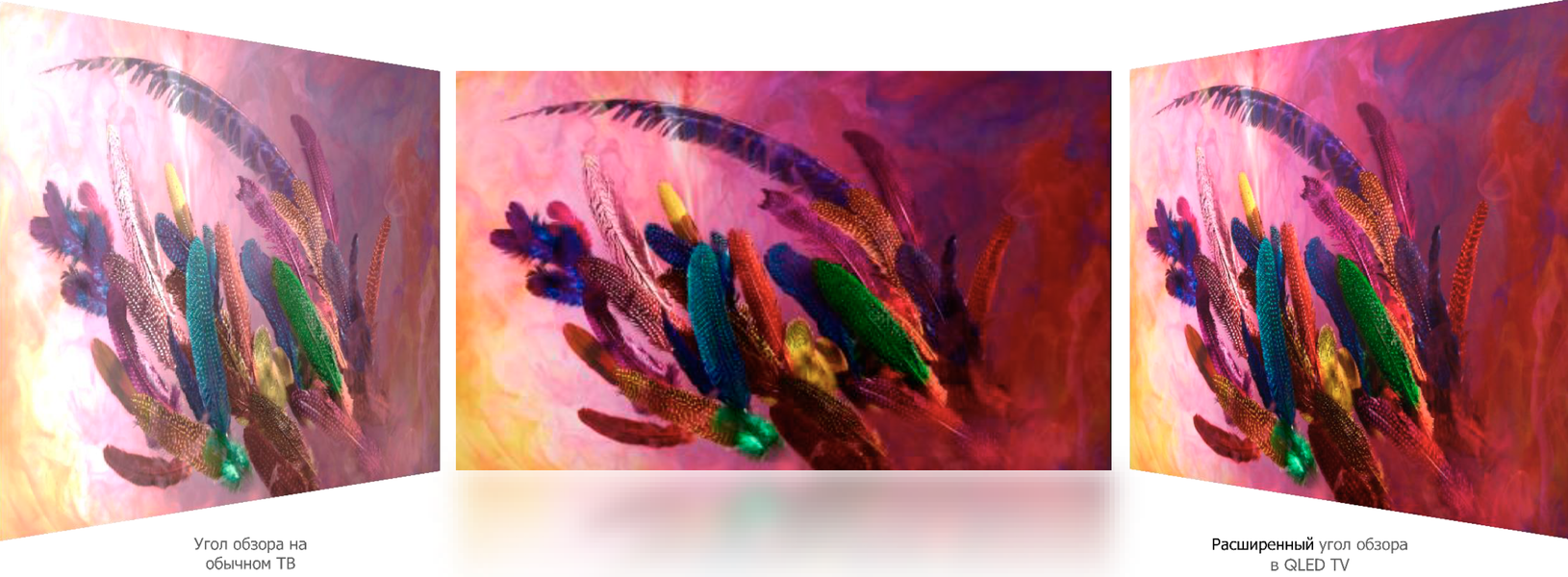 Хотя дисплеям со слоем жидких кристаллов свойственны не очень большие углы обзора, инженеры Samsung решили эту проблему в модельном ряду QLED TV 2019. Модели Q80R, Q90R и Q900R обеспечивают расширенный угол обзора за счёт двух дополнительных слоёв: первый концентрирует свет в нужном направлении и исключает любые утечки, а второй распределяет световой поток таким образом, чтобы свет распространялся одинаково во все стороны.