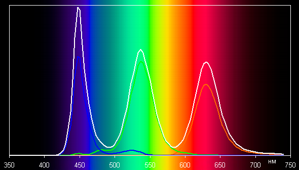 В чём же революция? В обычных ЖК-дисплеях подсветку обеспечивают белые светодиоды, и спектр у них не очень чистый. Цветовые составляющие, которые пройдут далее через поляризаторы, ЖК-матрицу и светофильтры, слабо разделены и неравномерны.