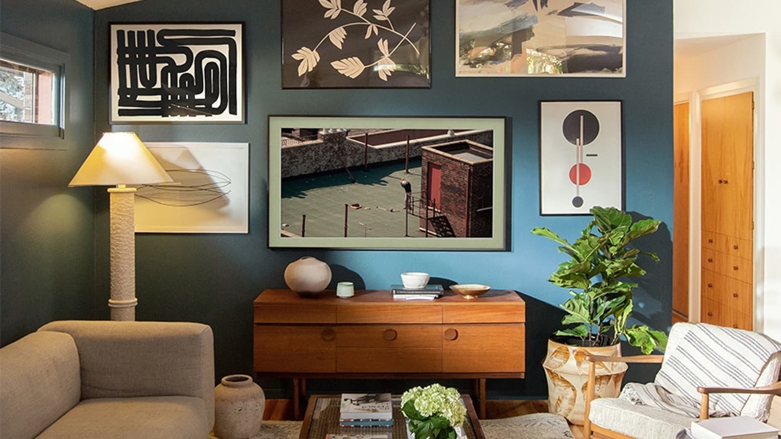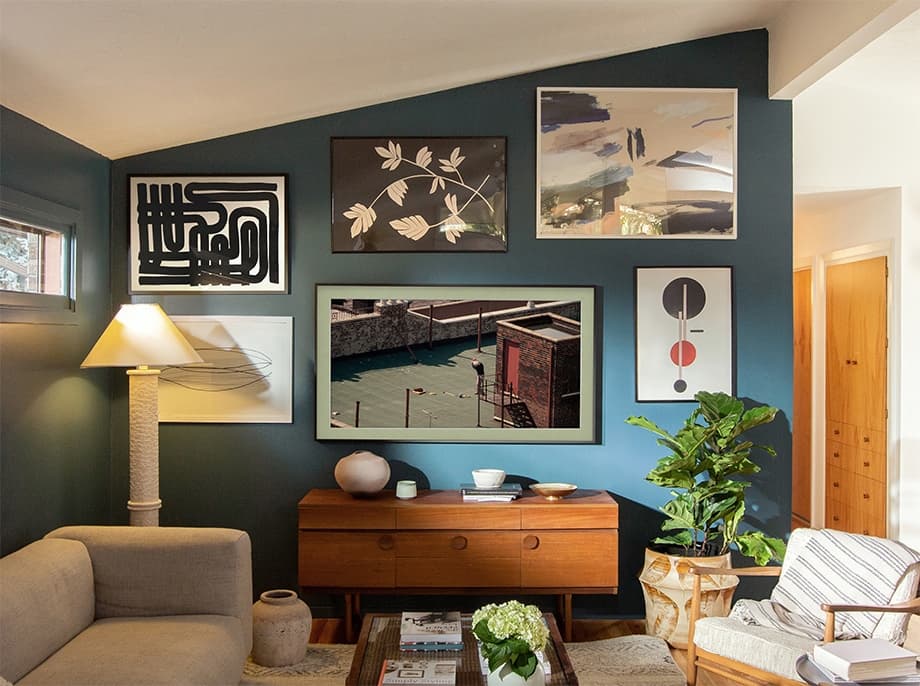 Экспериментируйте с цветом. Проявите креативность и не бойтесь экспериментировать с контрастными цветами. Сочетайте разные оттенки элементов декора или повесьте одну, но яркую картину на белую стену. Кстати, правильное оформление картины так же важно, как и она сама. Кирстен рекомендует присмотреться к телевизору The Frame: с ним вы сможете в одно нажатие выбирать произведения искусства и дополнять их сменными рамками. Samsung The Frame на российском рынке доступен в шести вариантах: с диагональю экрана 32”, 43”, 50”, 55”, 65” и 75” — так что можно подобрать подходящий под любое помещение вариант.