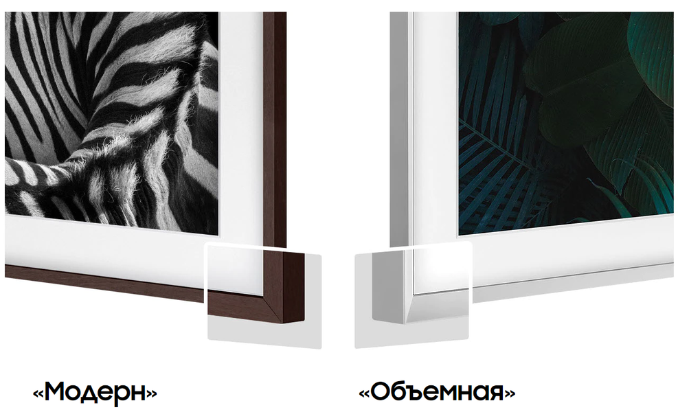 Для телевизоров The Frame 2021 модельного года Samsung предлагает два типа новых рамок: «Модерн» и «Объёмная». Рамки «Модерн» закрепить на телевизоре очень просто: они удерживаются с помощью магнитов, так что процесс смены рамок занимает считанные секунды. Эти рамки доступны в трёх цветовых исполнениях: коричневом, древесном и белом. Новый классический тип рамки «Объёмная» со скошенными под углом 45° внутренними гранями и доступен в белом и кирпично-красном цветах.