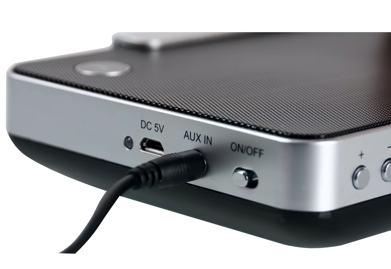 Помимо беспроводного соединения с источником звука акустику можно подключить к ноутбуку, планшету, смартфону или плееру с помощью кабеля – для этого на корпусе есть стереовход.