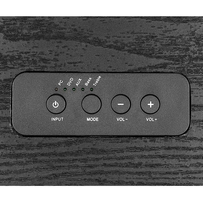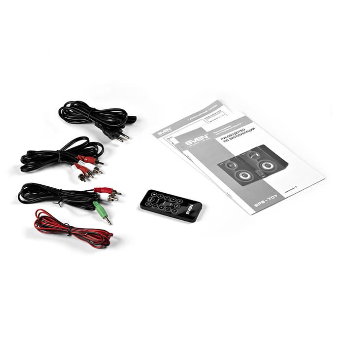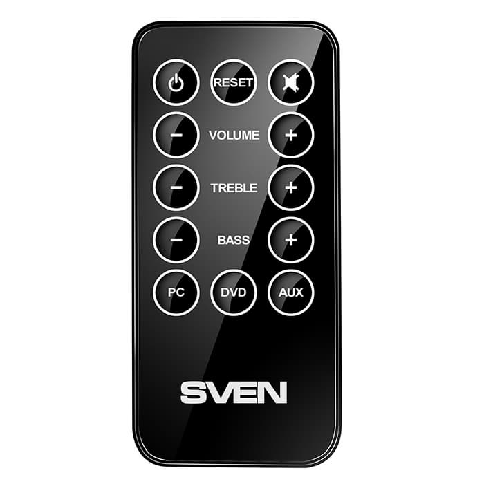 Удобная панель управления SVEN SPS-707, расположенная на верхнем основании активной колонки, содержит в себе ключевые опции для настройки системы. С их помощью можно изменять «характер» звучания системы, то есть регулировать верхние и нижние частоты, а также переключать источники звука между собой. Вес и габариты колонок свидетельствуют о том, что они принадлежат к классу стационарной акустики, поэтому система очень кстати оснащена дистанционным пультом управления. На нем продублированы все функции, присутствующие на панели управления.