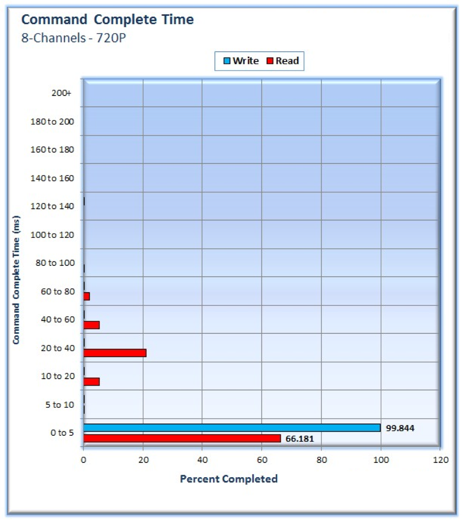 Критерием измерений является показатель CCT (Command Competition Time), отражающий скорость выполнения команд в миллисекундах. Запись видео осуществлялась в течение часа в режиме 1280 x 720 (25 к/сек.), при этом к системе последовательно подключались 8, 16 и 32 камеры. Предварительно мы также подготовили часовую запись в HD-разрешении и включили ее трансляцию непосредственно с диска. Результаты отражены на графиках, представленных ниже.