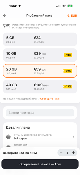 Для новых пользователей Yesim предлагает скидку 15% на первую покупку — для этого нужно ввести промокод GETYESIM15.