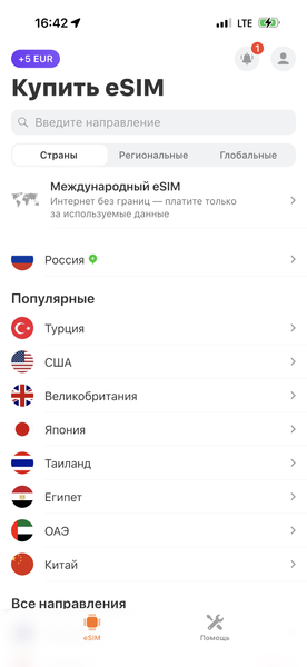 Yesim — это сервис туристических eSIM-карт. Покупаете пакет дней/данных (об этом ниже) в приложении или на сайте, загружаете профиль eSIM на телефон и получаете мобильный интернет в нужной стране. Настройки минимальны: нужно просто включить eSIM-ку и разрешить в её настройках роуминг данных. Она будет работать сразу после приземления, то есть написать близким «Всё в порядке, долетел» можно будет ещё из самолёта.