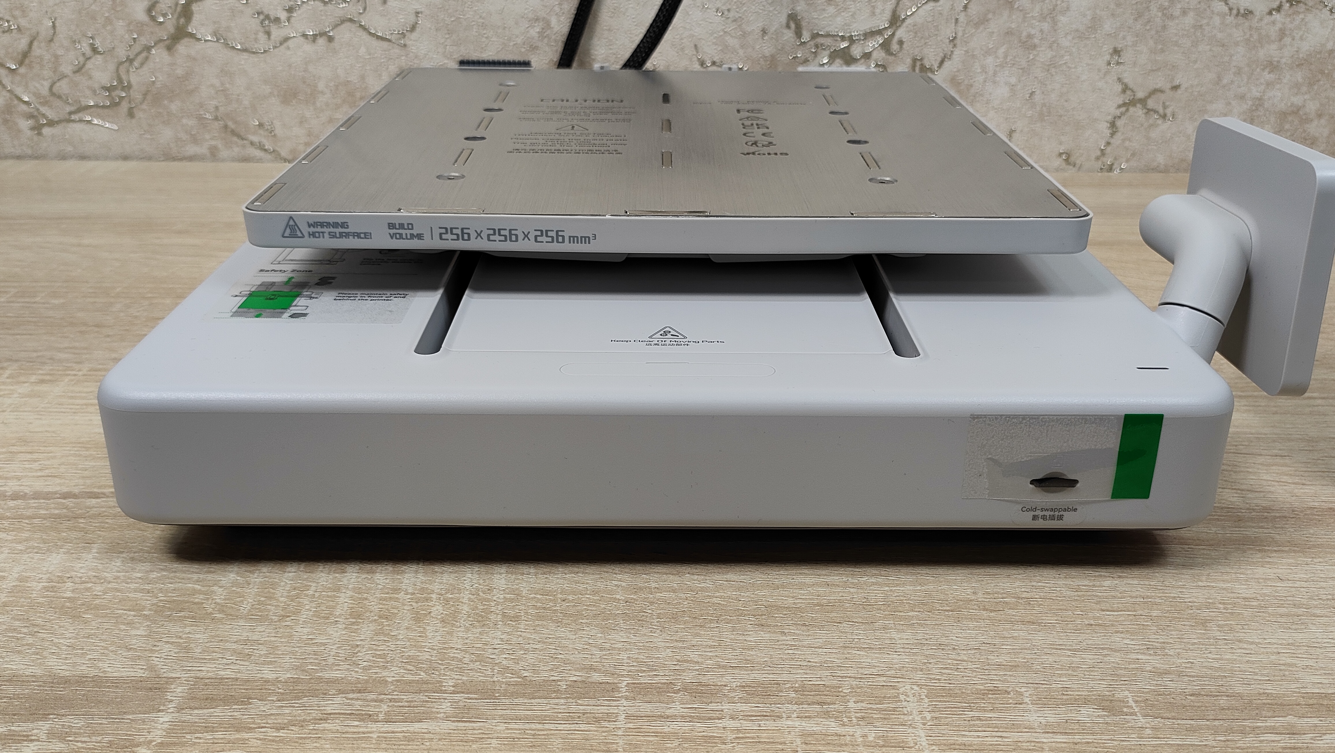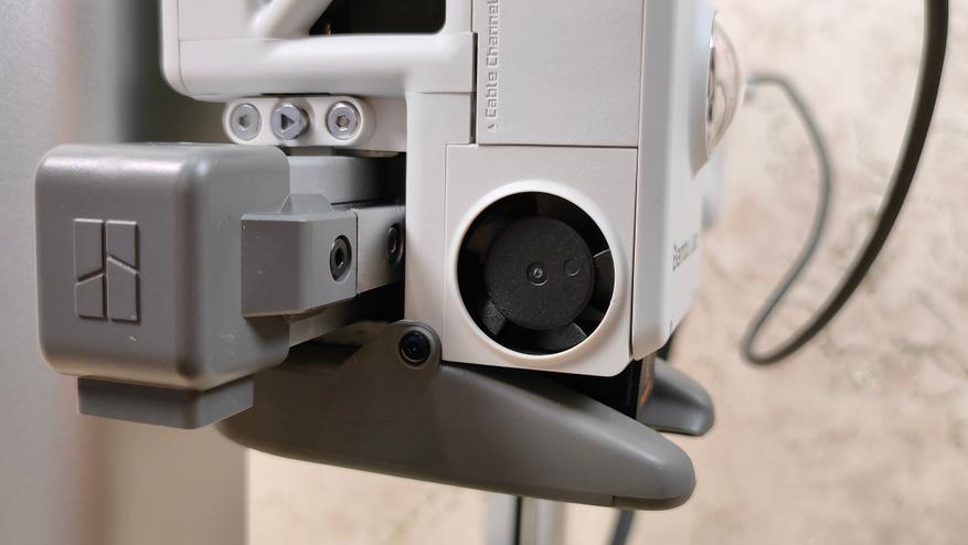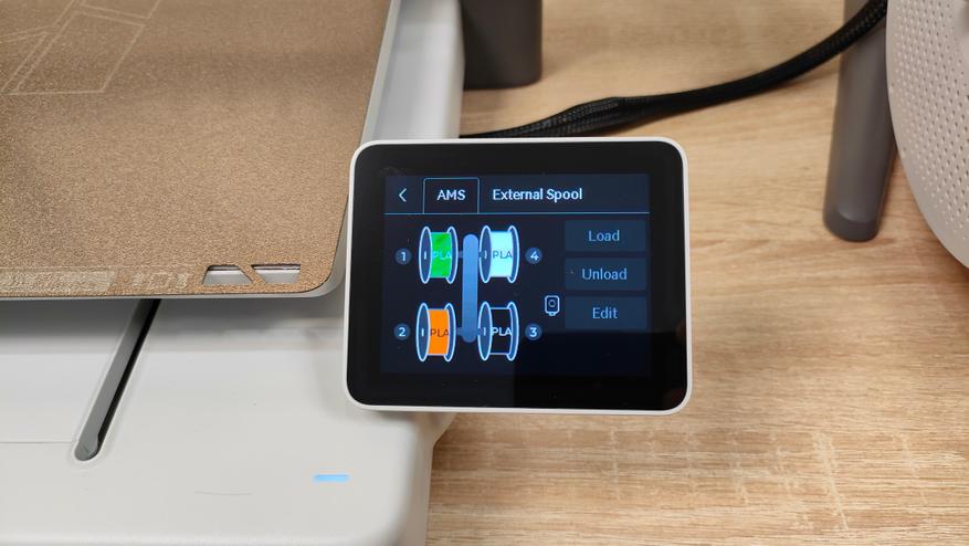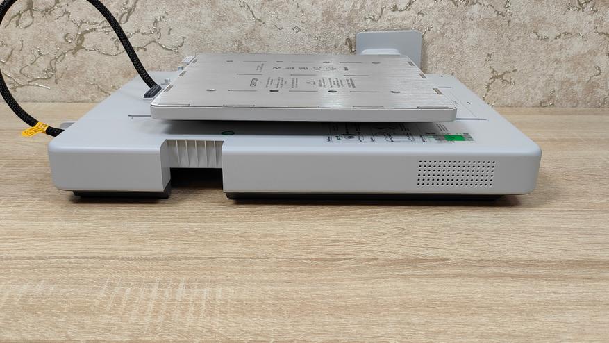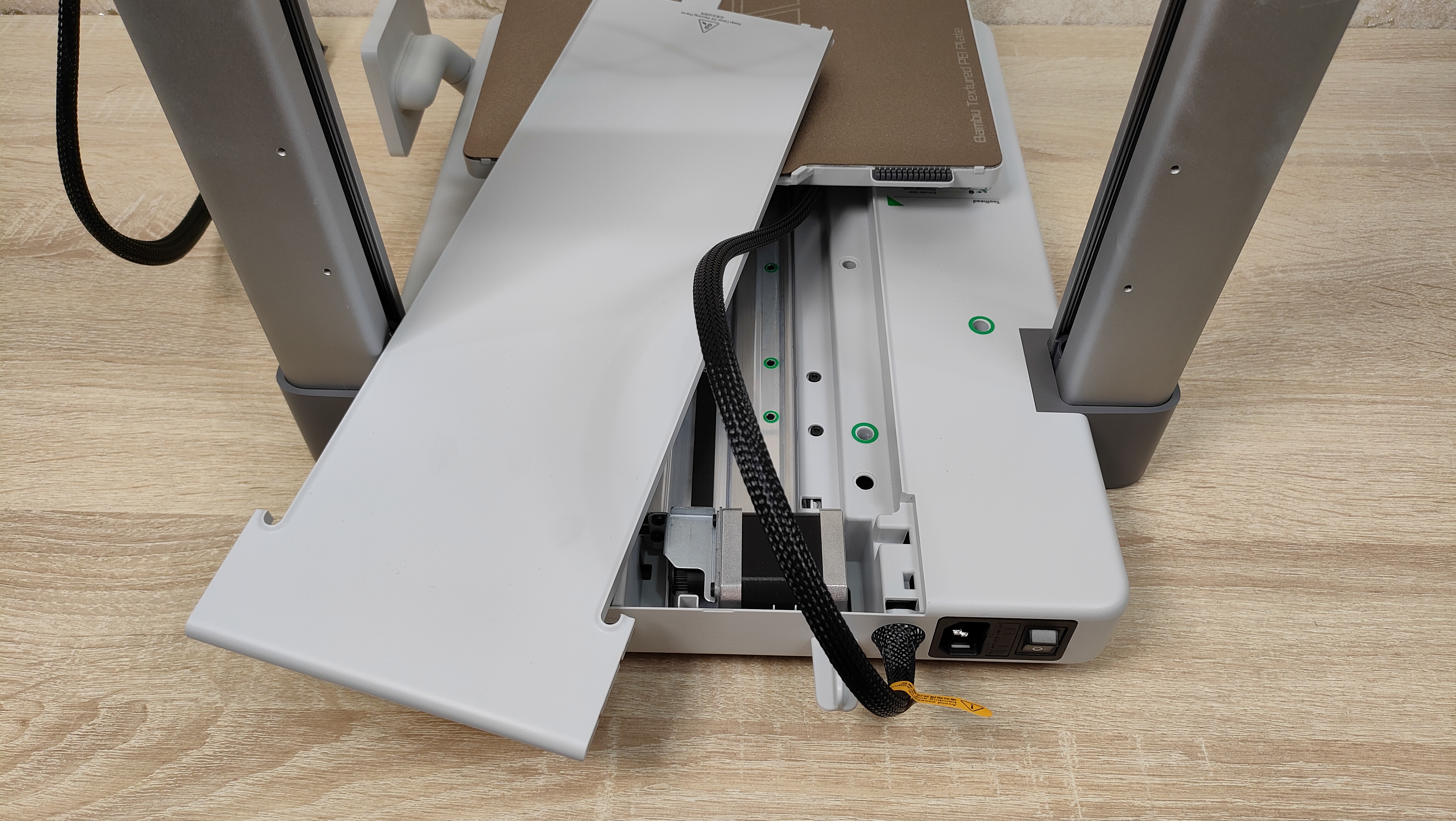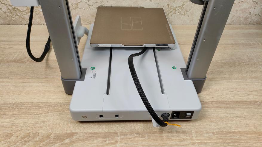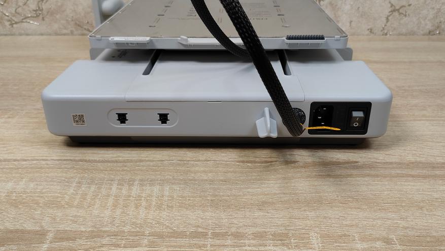 У стола соответственно также надо снять все стопоры и проставки, которые не дают ему двигаться во время транспортировки. Это ось Y с платформой в которой есть магниты. Кроме того есть экран, с углом поворота на 90°, то есть можно поставить принтер боком, например, если есть какие-то ограничения по площади. Сзади есть кнопка включения, разъём питания, и ещё две розетки, в одну из которых можно подключить систему AMS.