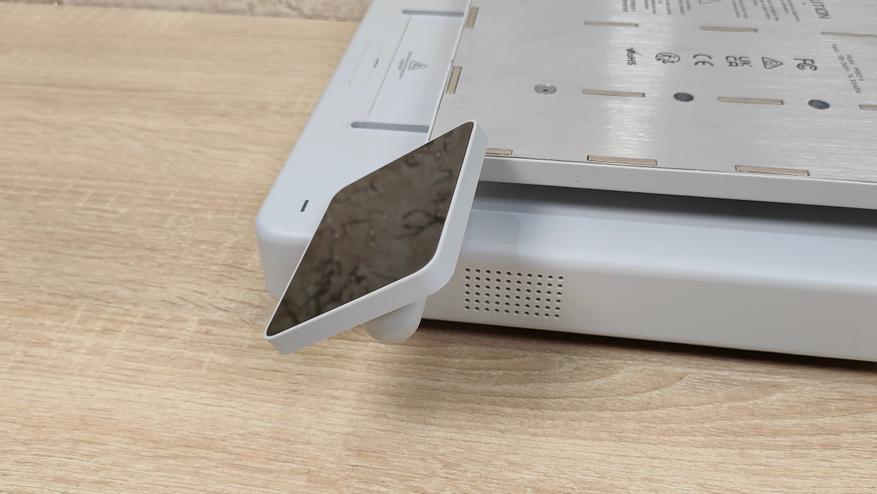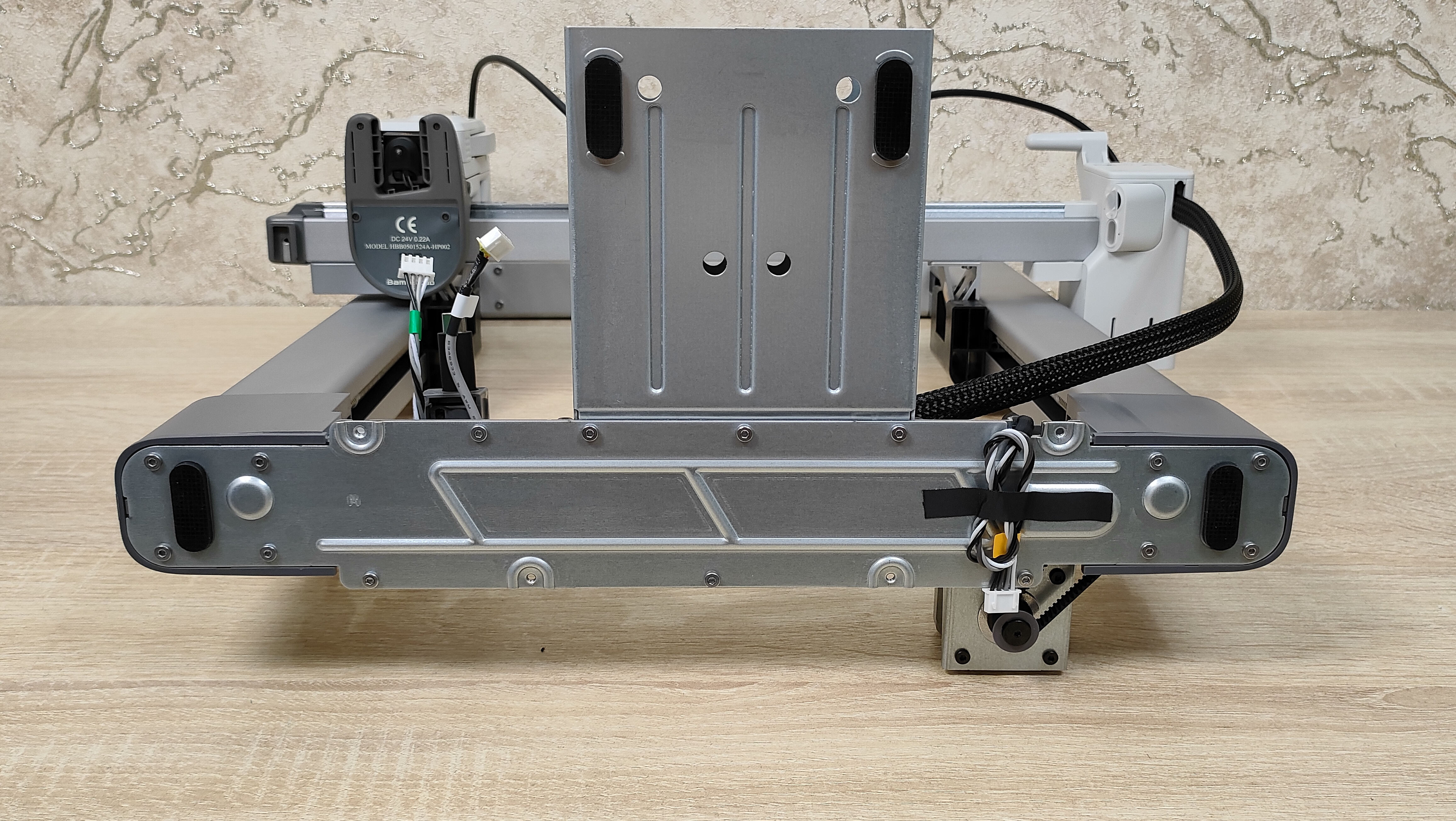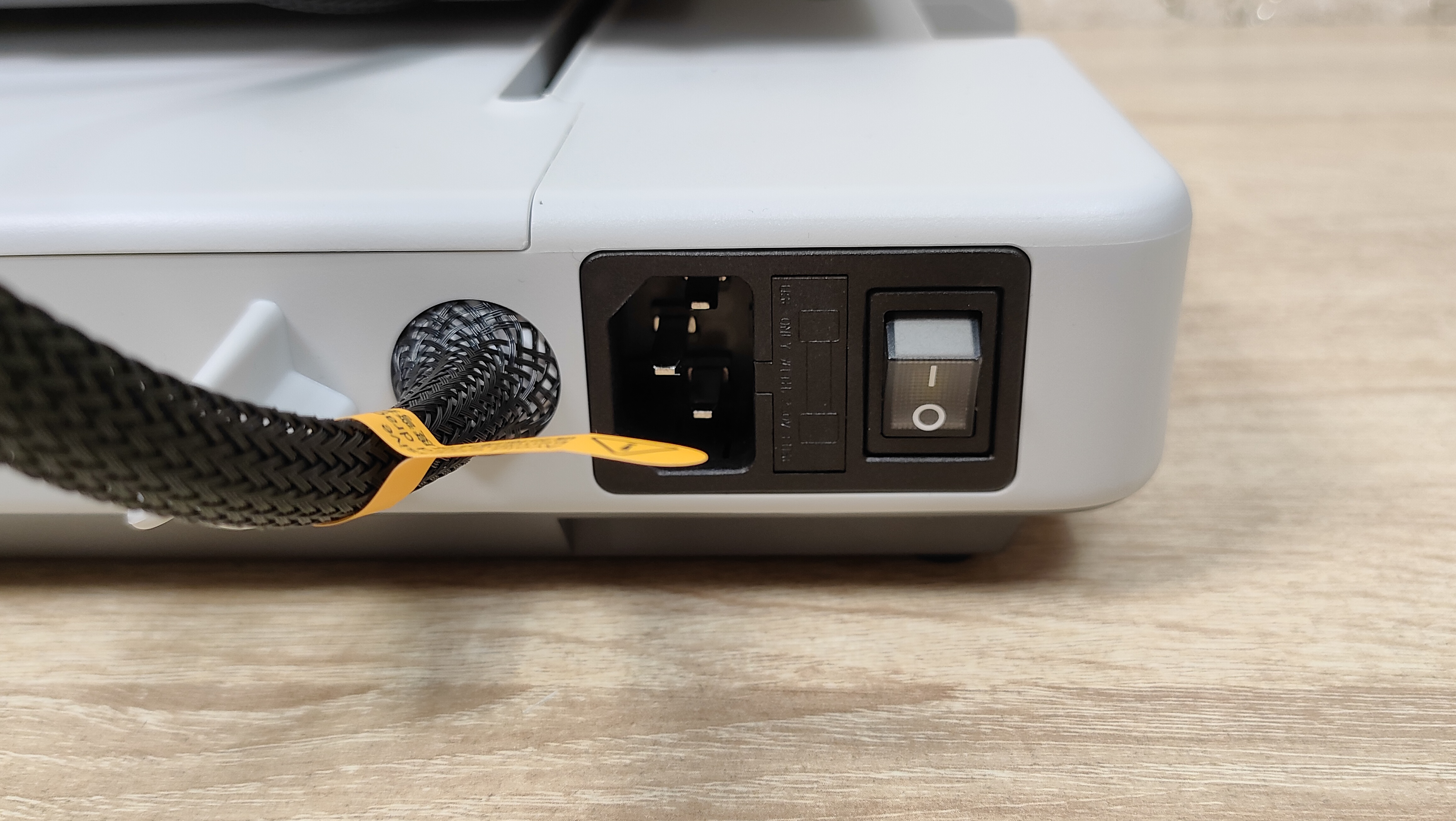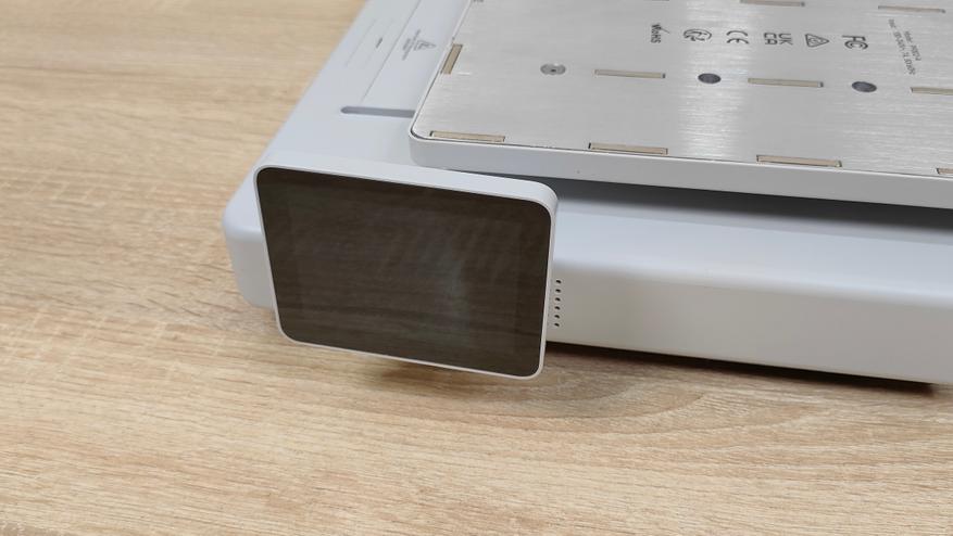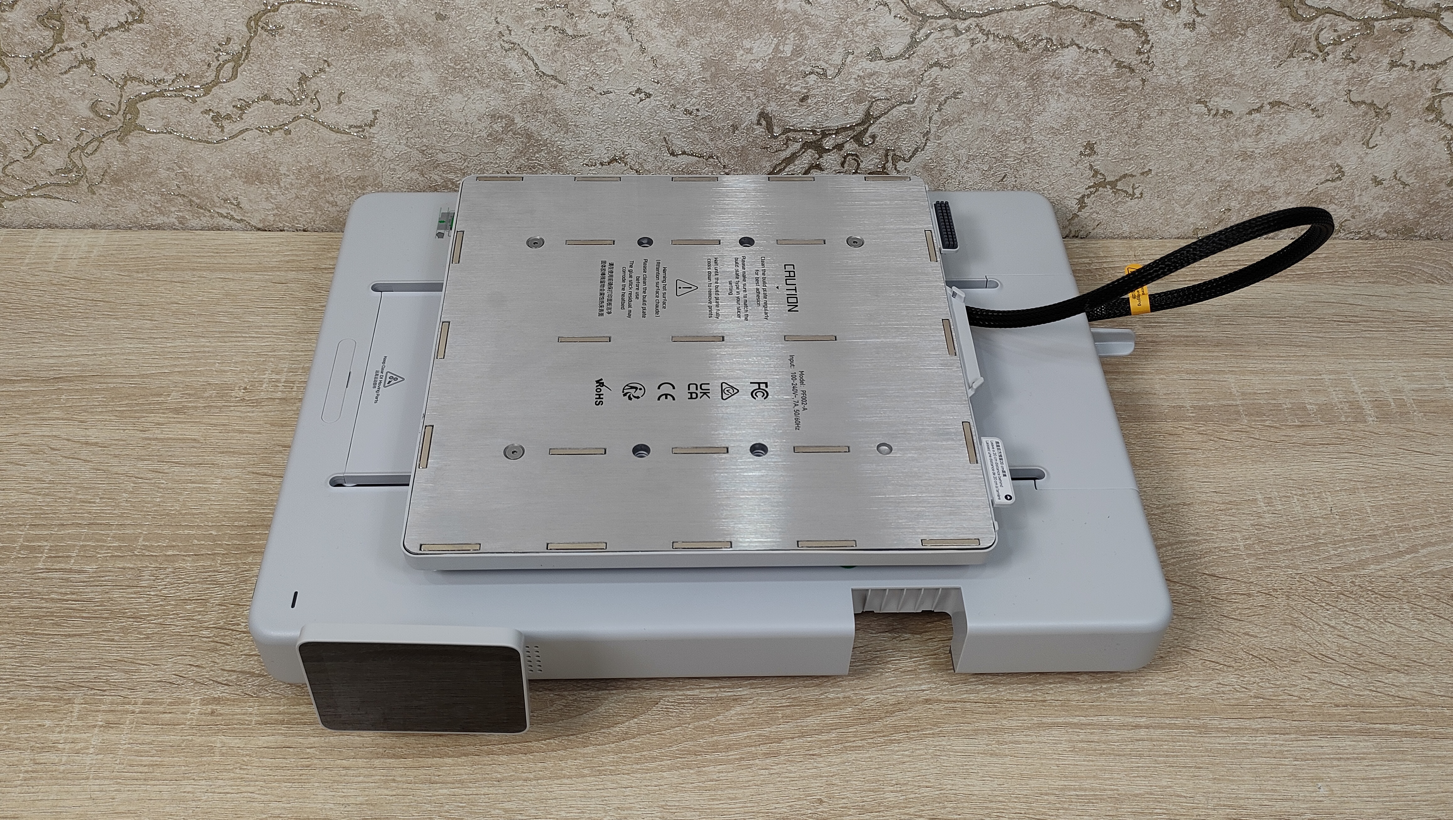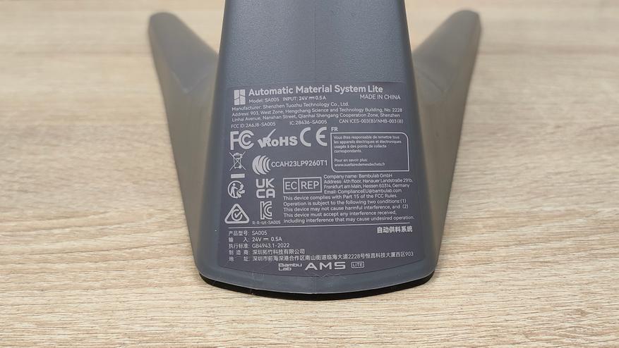 У стола соответственно также надо снять все стопоры и проставки, которые не дают ему двигаться во время транспортировки. Это ось Y с платформой в которой есть магниты. Кроме того есть экран, с углом поворота на 90°, то есть можно поставить принтер боком, например, если есть какие-то ограничения по площади. Сзади есть кнопка включения, разъём питания, и ещё две розетки, в одну из которых можно подключить систему AMS.
