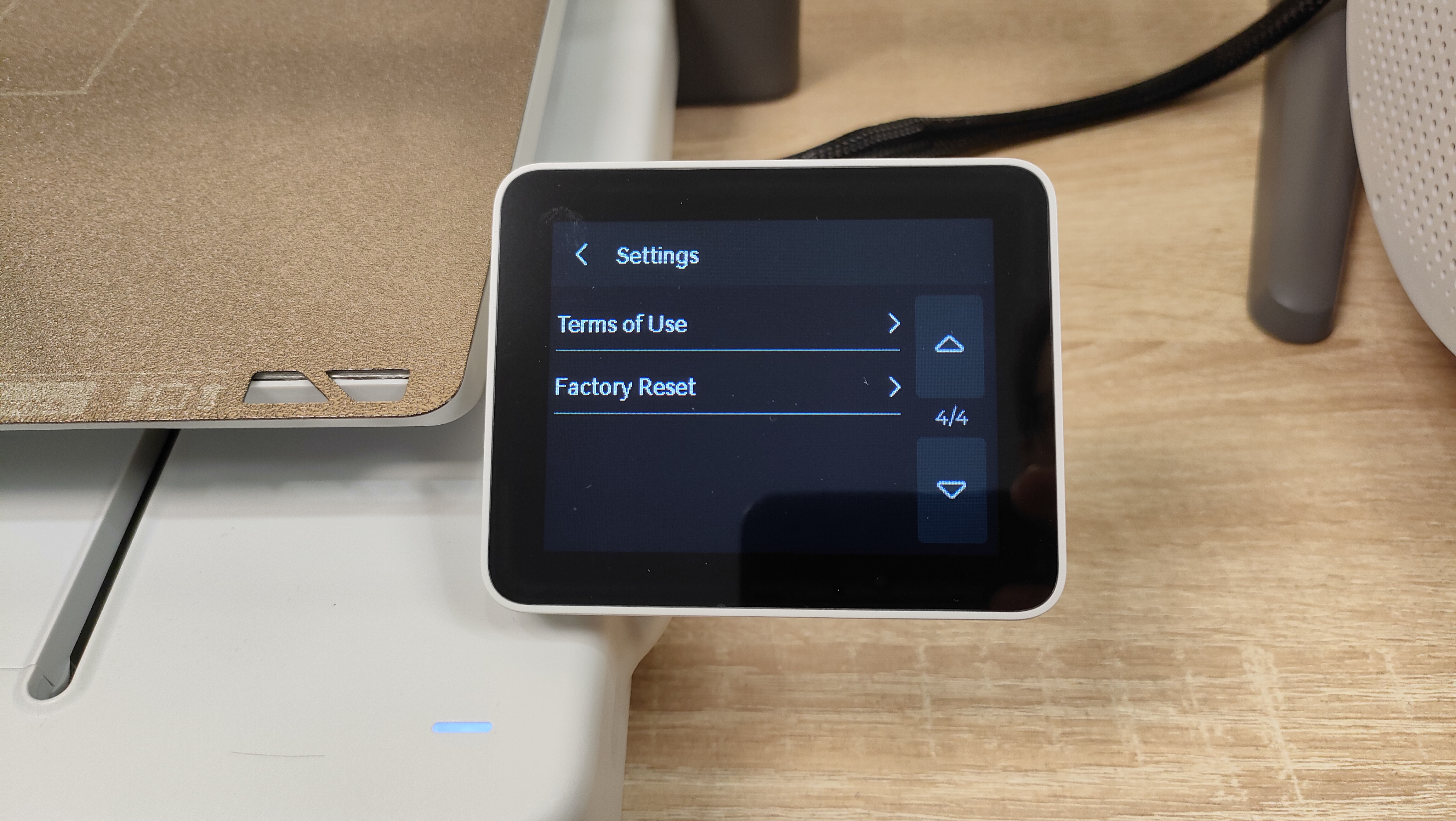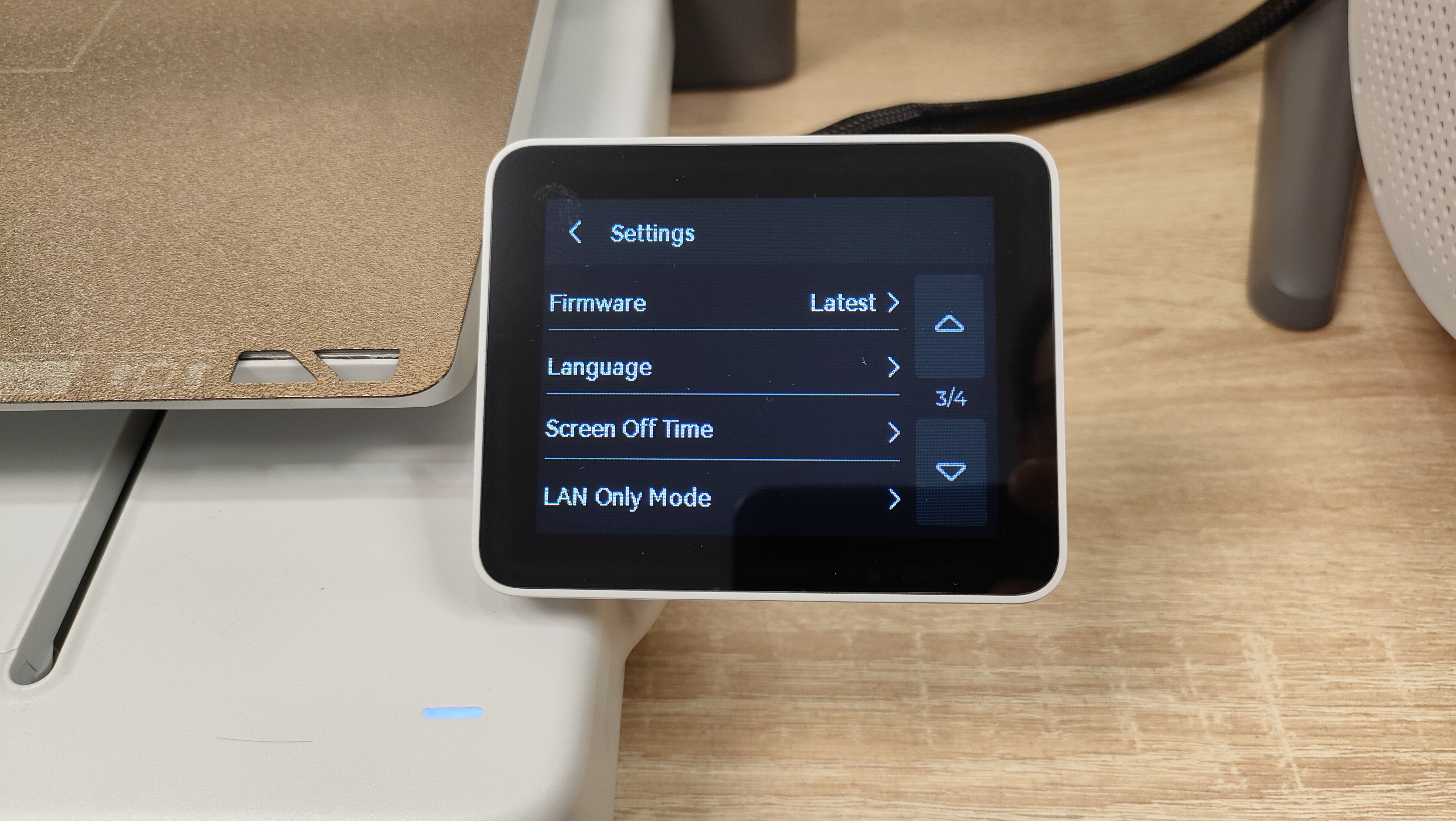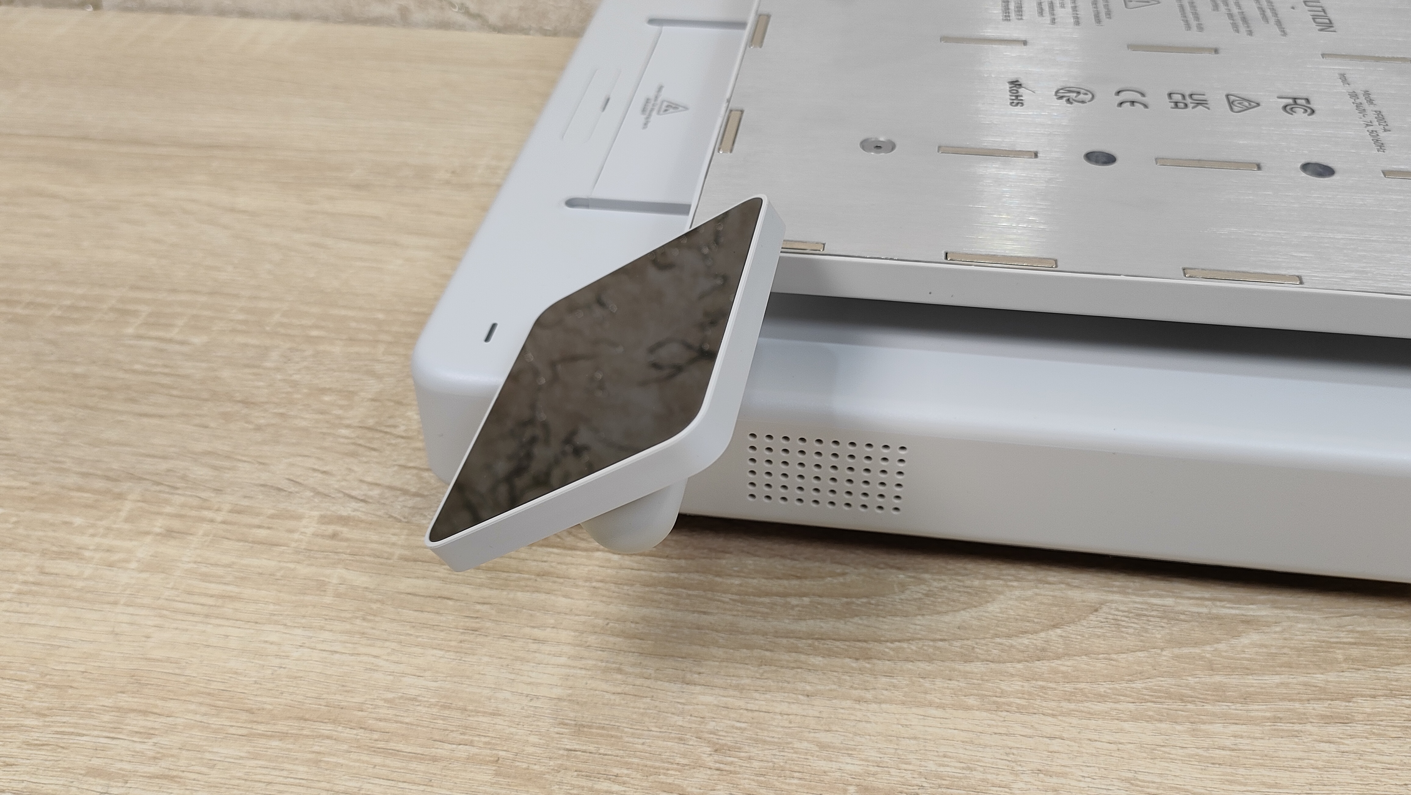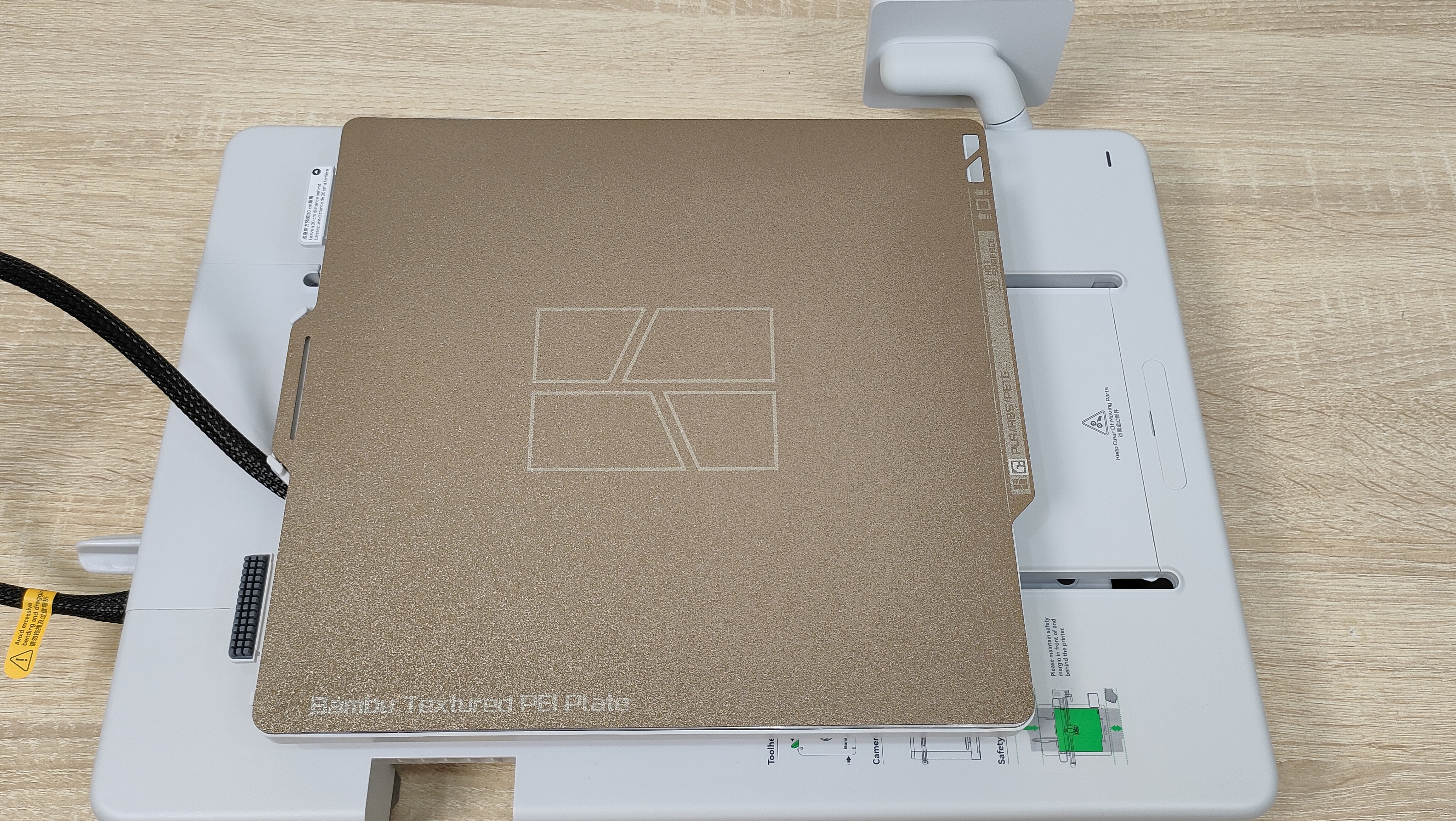 У стола соответственно также надо снять все стопоры и проставки, которые не дают ему двигаться во время транспортировки. Это ось Y с платформой в которой есть магниты. Кроме того есть экран, с углом поворота на 90°, то есть можно поставить принтер боком, например, если есть какие-то ограничения по площади. Сзади есть кнопка включения, разъём питания, и ещё две розетки, в одну из которых можно подключить систему AMS.