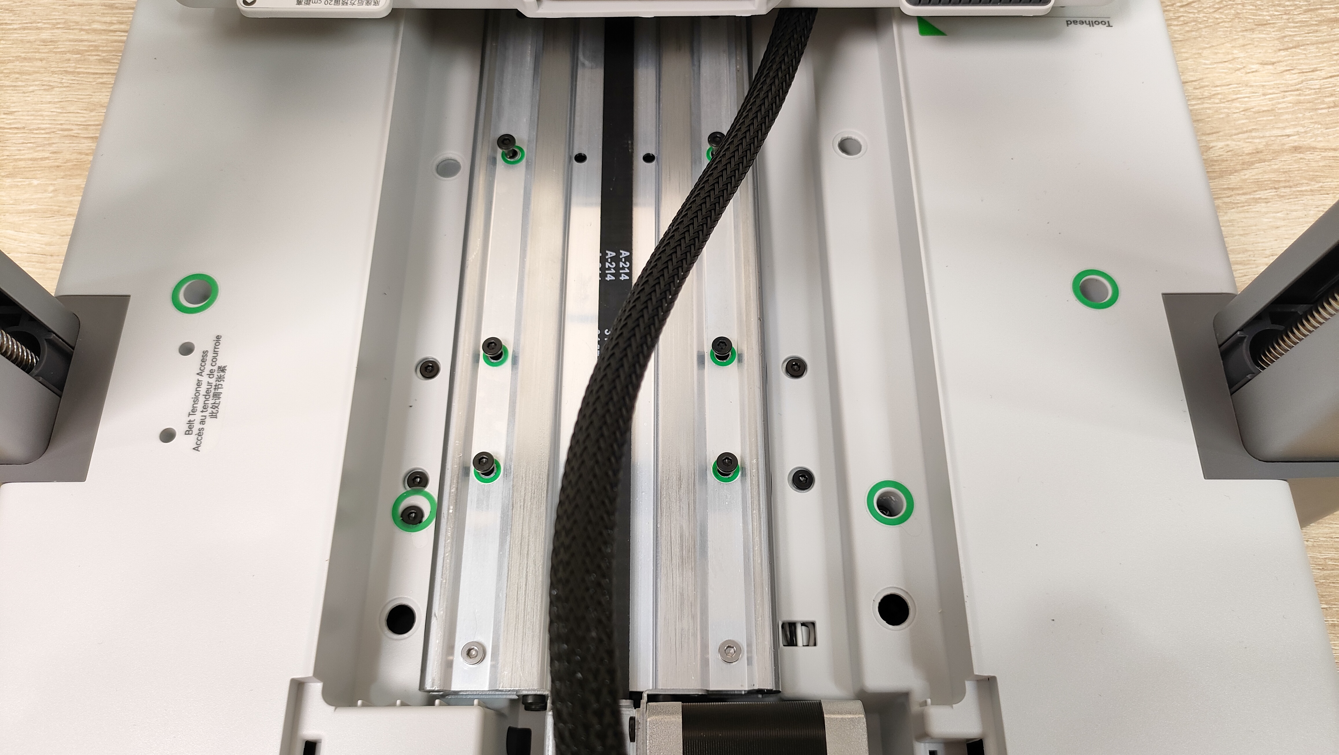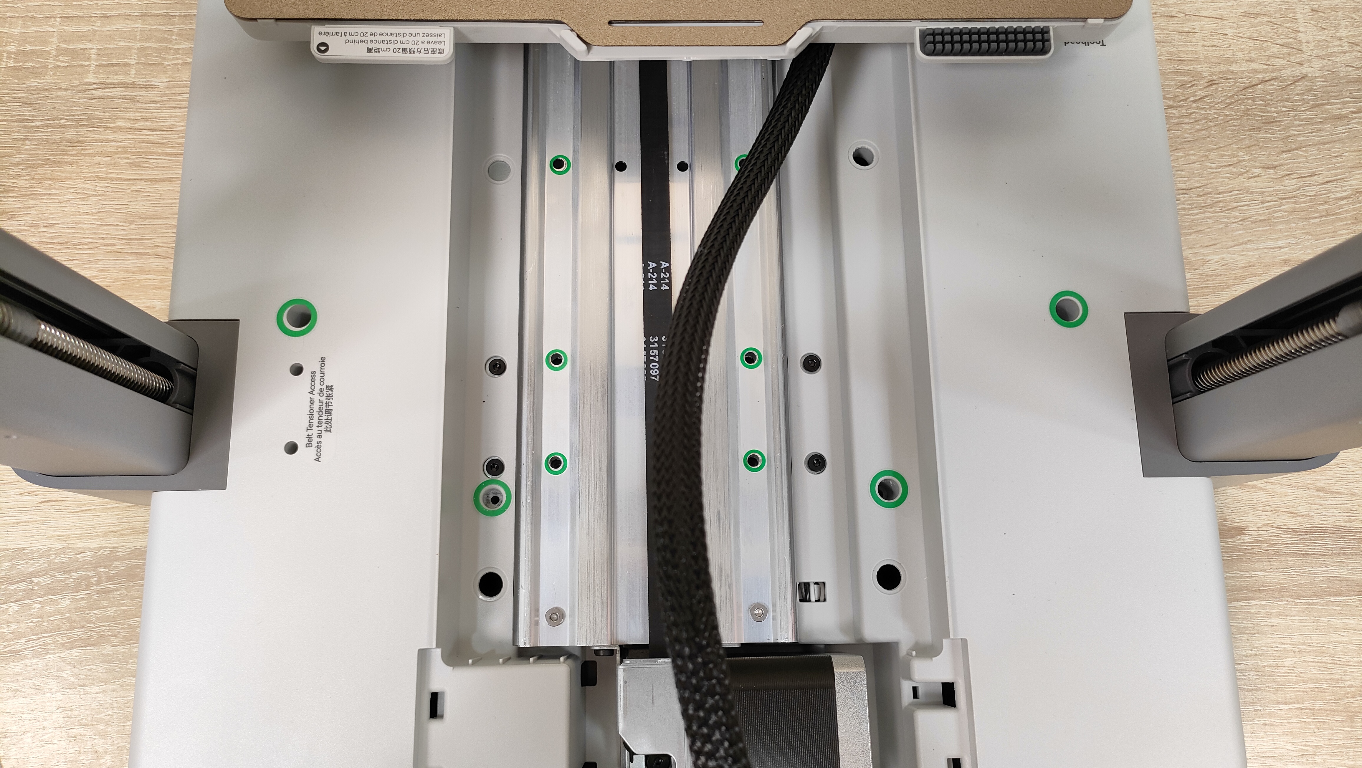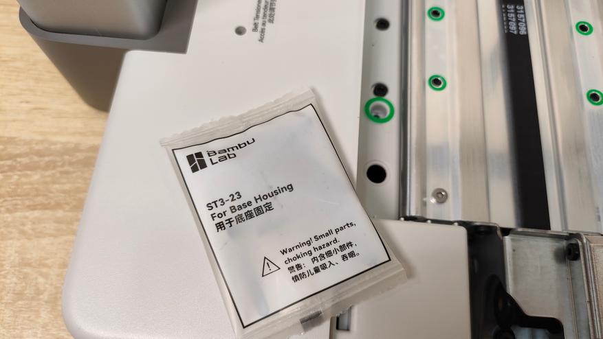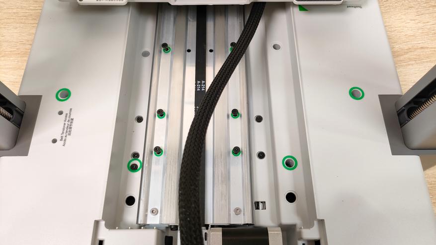 На этом этапе нужно продеть стол в раму и закрепить его комплектными винтами, которые указаны в руководстве определённым номером и этим же номером помечены на пакете. Для этой процедуры нужно будет сдвинуть стол и снять защитную крышку. Все места, куда необходимо вкрутить винт обозначены зелёным кружком, правда в одном месте отверстие как будто не доделано, но я всё равно победил и вкрутил туда винт.