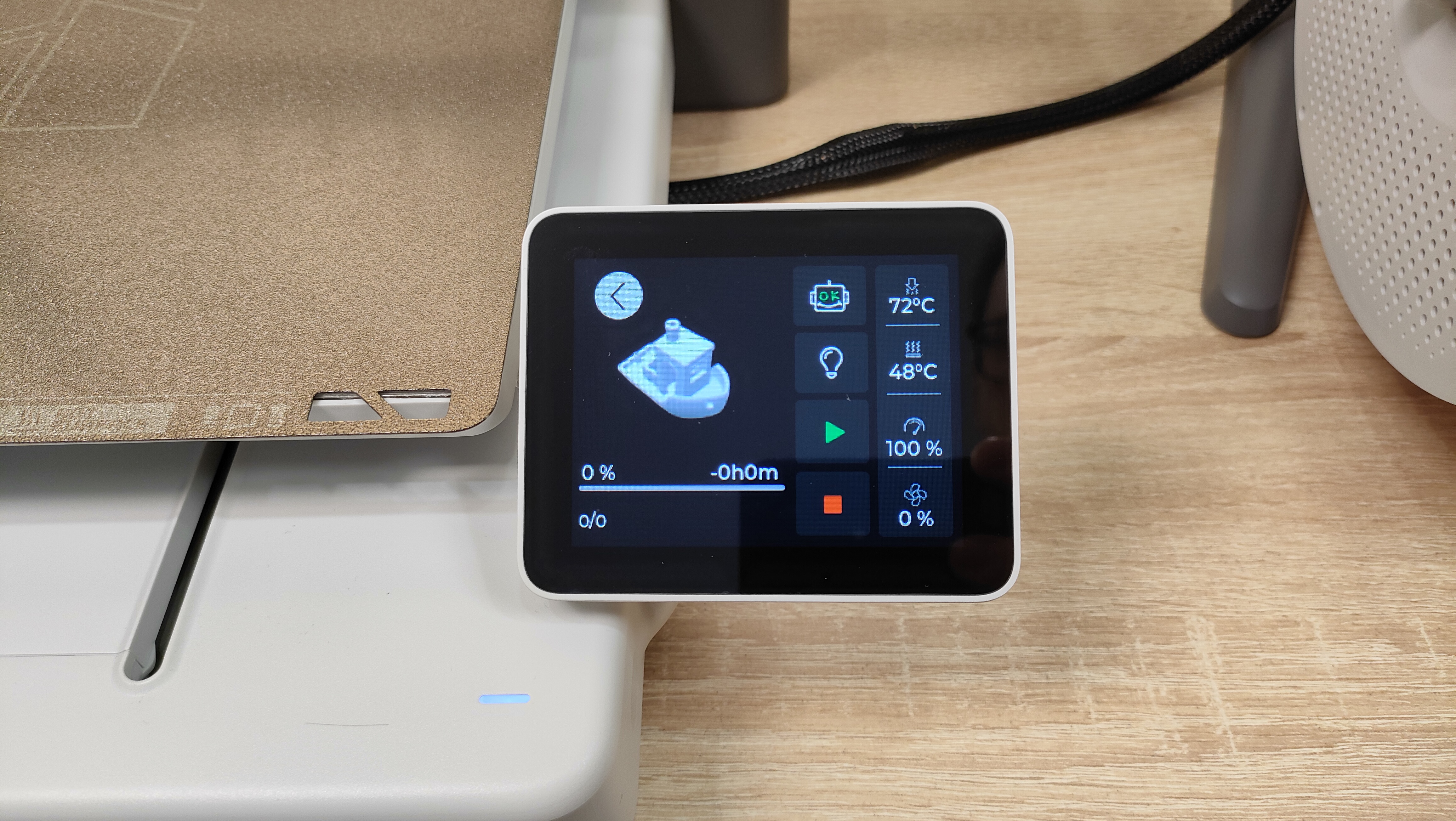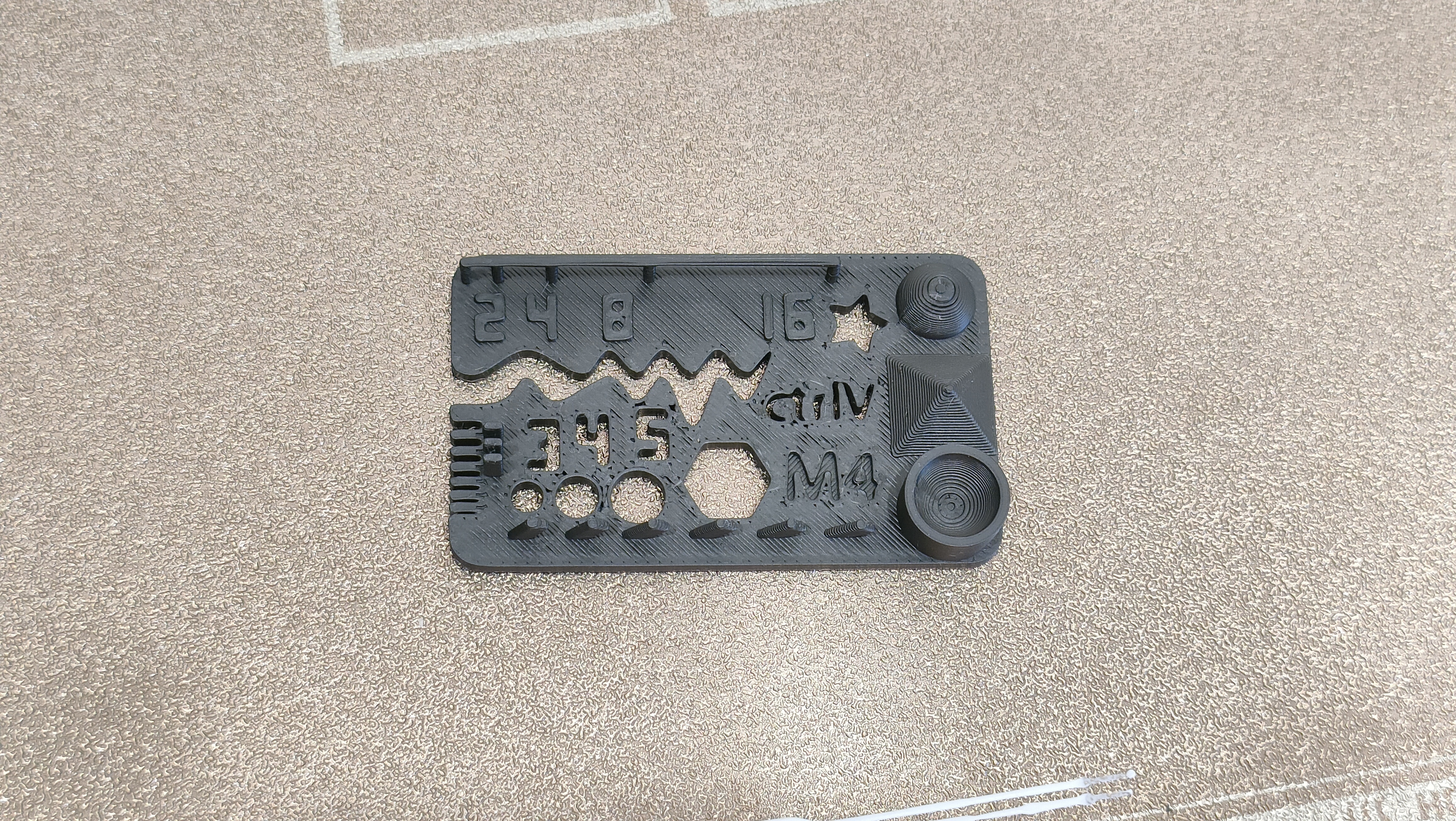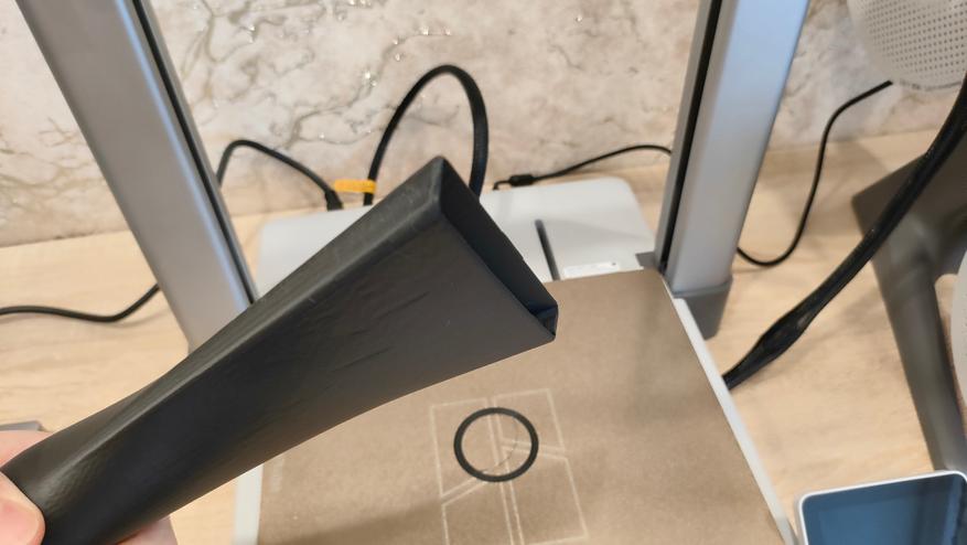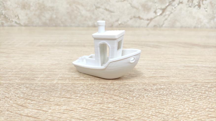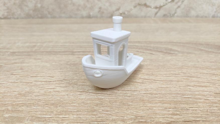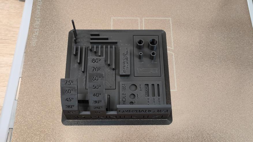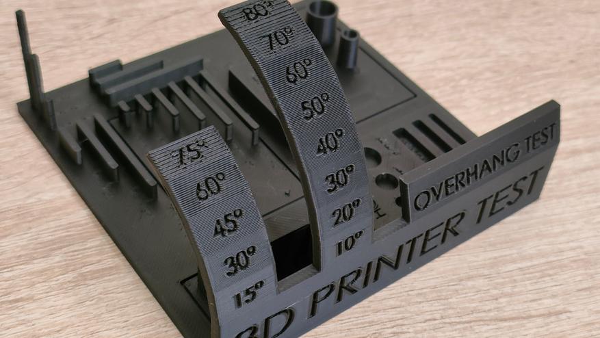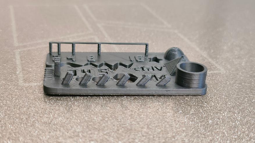 Крупная тестовая модель напечаталась нормально со всеми стандартными настройками, не стал менять ни скорость, ни высоту слоя, ни обдув, ни подогрев, всё как есть. Собственно всё и распечаталось, кроме легенды, которая подписывает, что где есть. Даже нависания без каких-либо поддержек распечатались корректно.