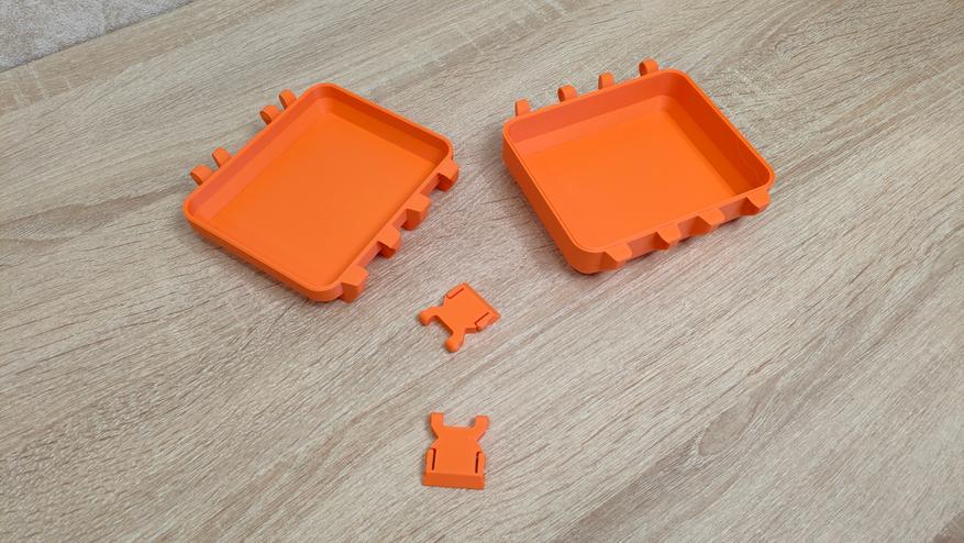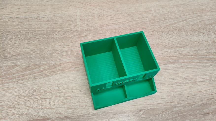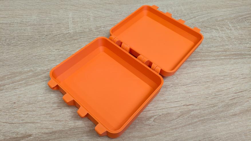 Все части коробки распечатались на одном столе, после, было собрана воедино и готова к применению. У меня, то тут, то там, лежат разного рода переходники USB, флешки, держатель для переключателей от клавиатуры и подобная мелочь, которая место занимает немного, но все где-то валяется. Поэтому, было принято решение собрать всё в одно место и закрыть крышкой c защёлками, то есть? если эту коробку уронить она не раскроется, высыпав содержимое. Касаемо насадки на пылесос, то ее приспособил под влажную уборку на строительный пылесос. А еще, можно написать «Gridfinity» и погрузиться в бесконечный мир системы хранения.