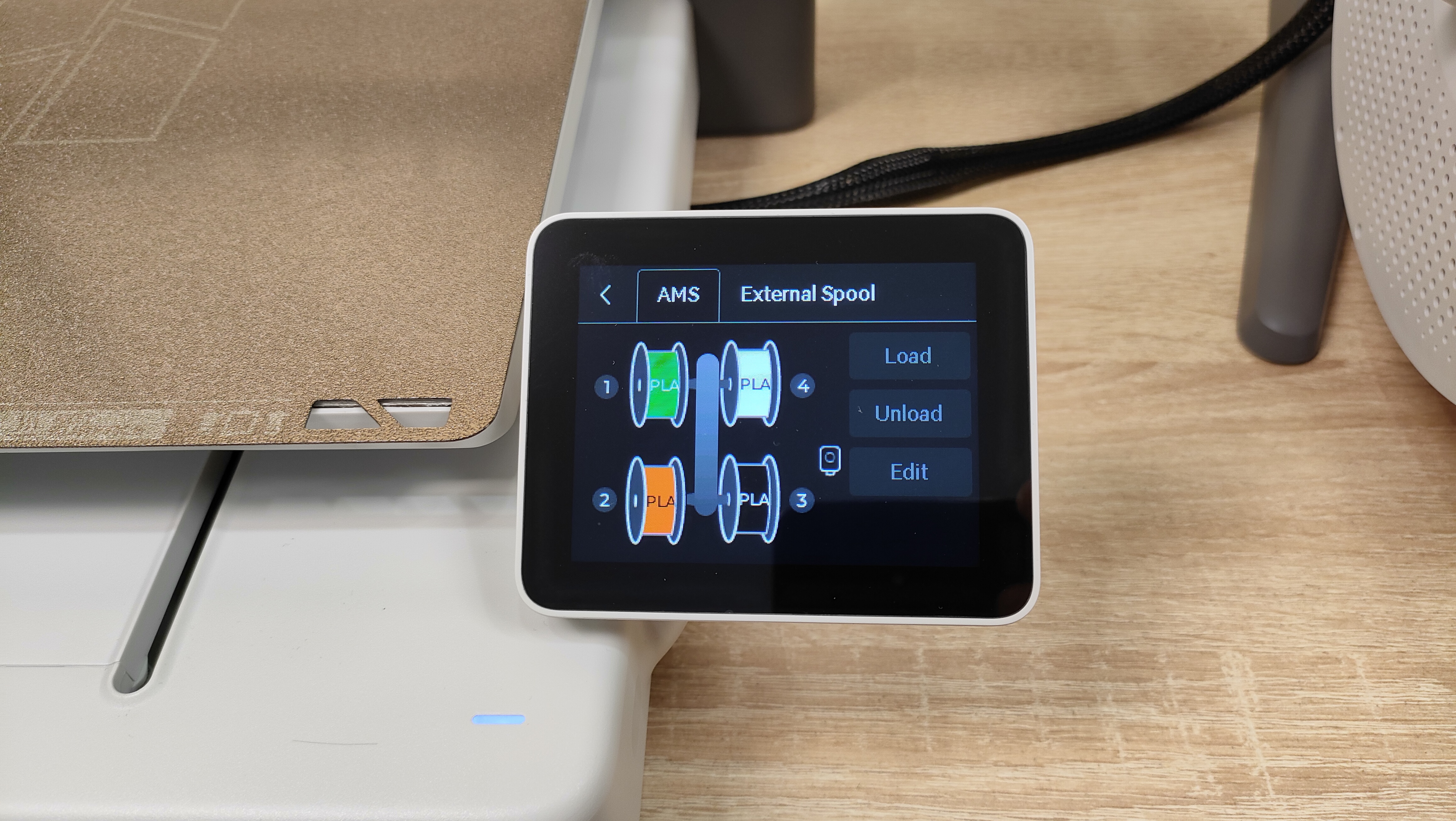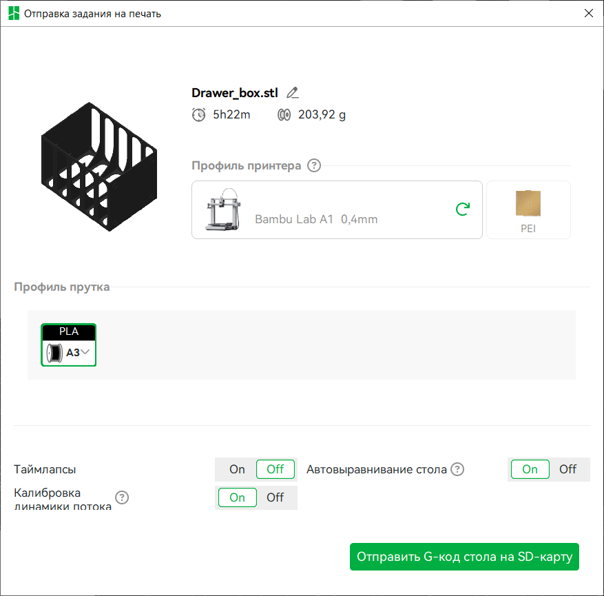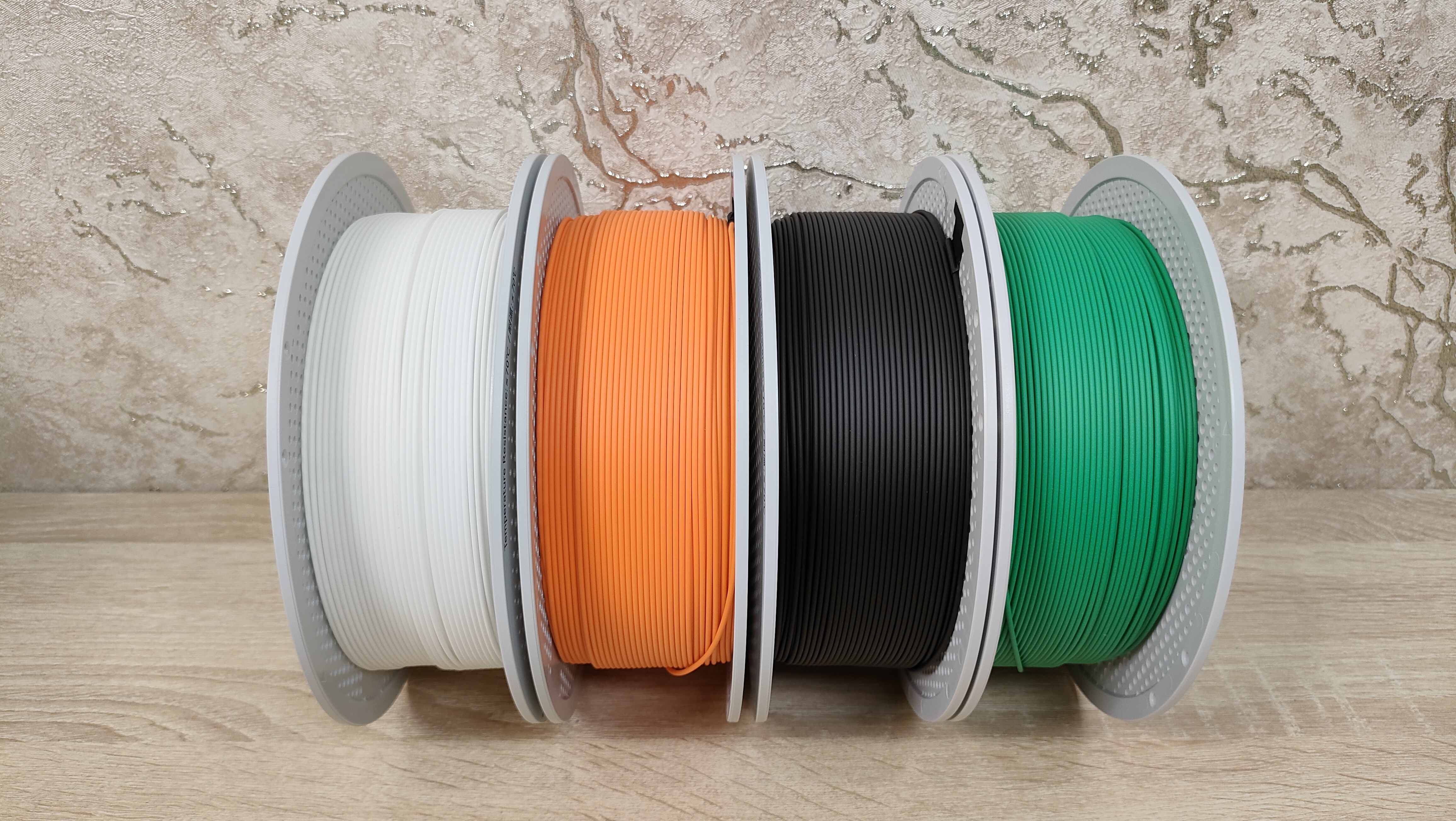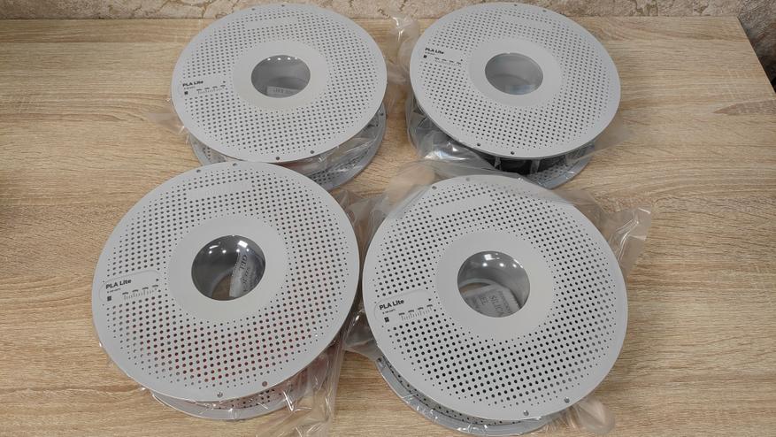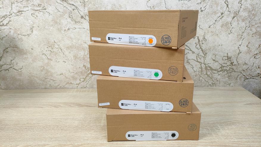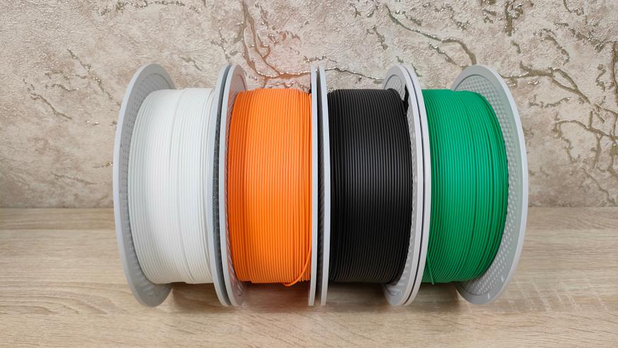 Тесты буду проводить на фирменном филаменте Bambu Lab PLA Lite. Фирменным отличием данного филамента от других — это наличие NFC метки, по которой определяется подлинность и заодно подхватывается готовый профиль, который никак не нужно настраивать. Удобно. У меня на руках четыре цвета: белый, чёрный, оранжевый, зелёный.