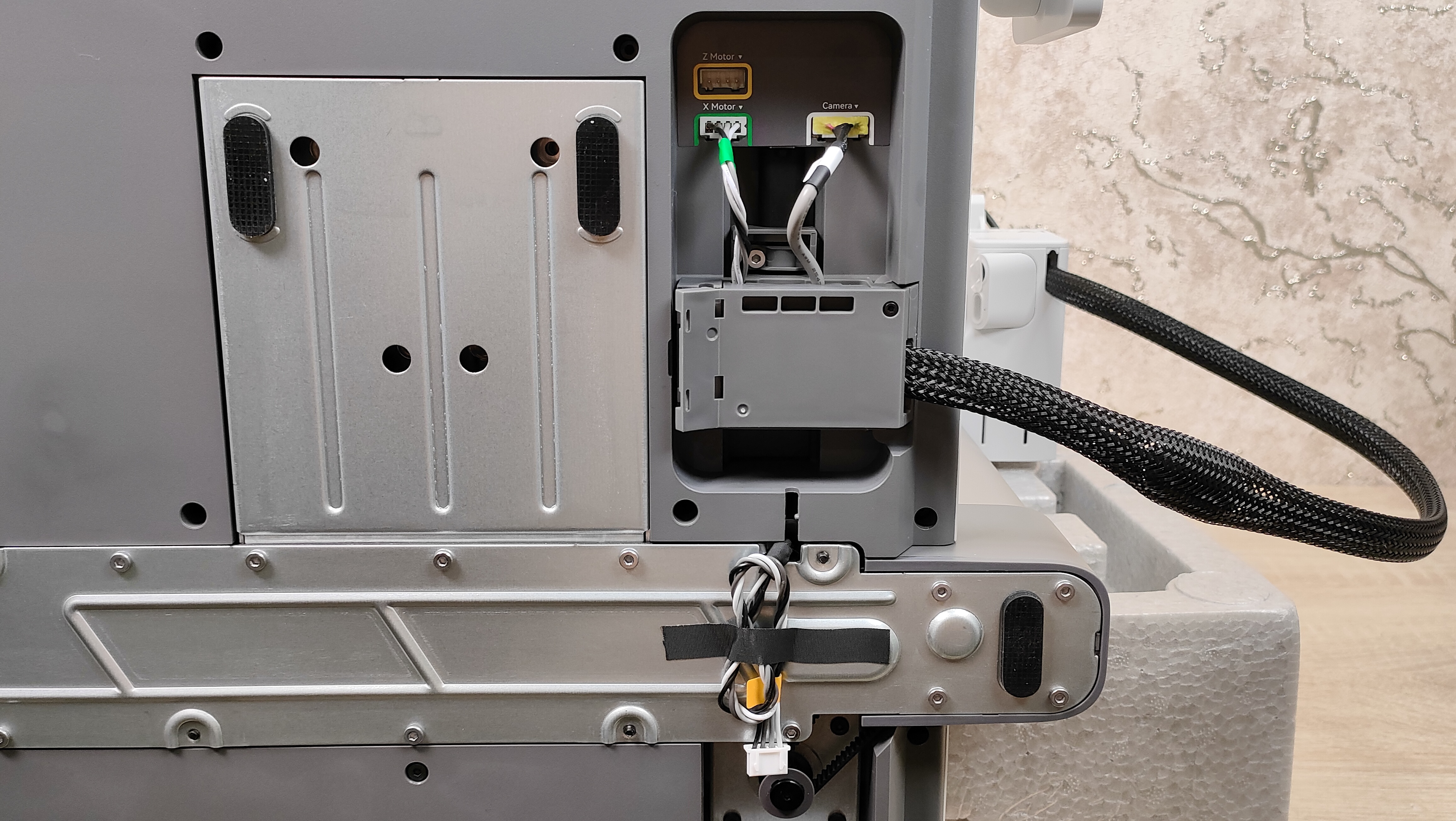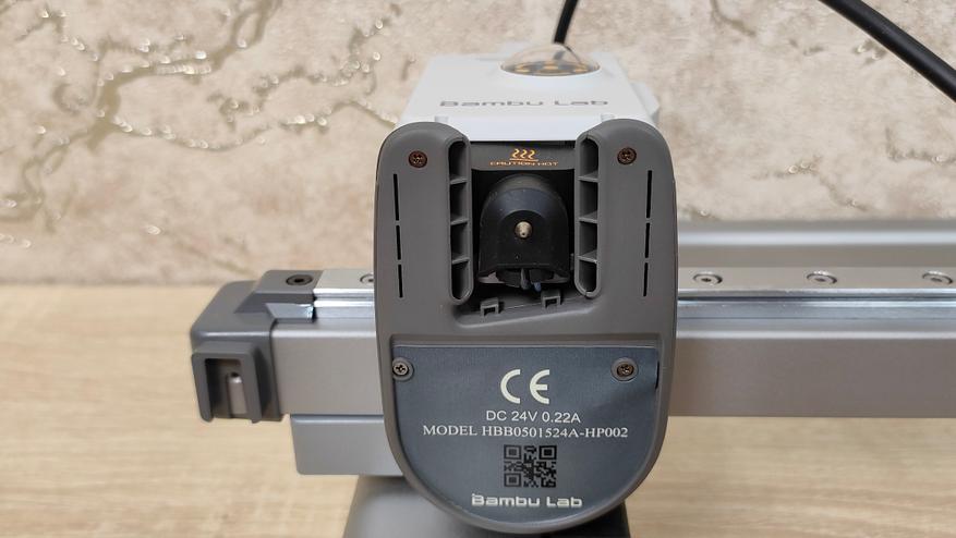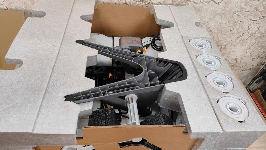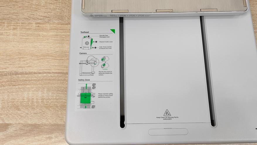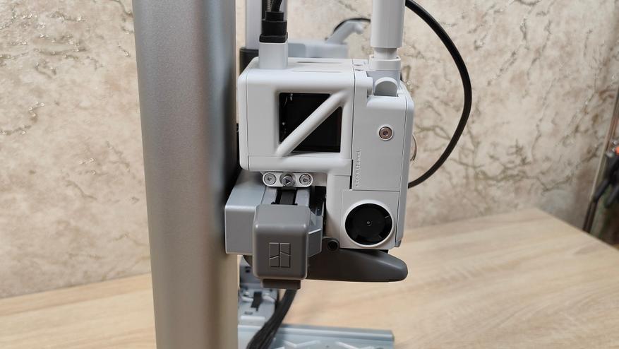 Первым пунктом идёт снятие транспортных защитных элементов с направляющей X, которая зафиксирована для избежания повреждений во время транспортировки. Экструдер уже установлен и собран, и не требует каких-то отдельных манипуляций. Уже на этом этапе видно, что у данного принтера практически всё готово к работе, осталось только крупноузловая сборка из двух частей, а также соединить провода. В экструдере установлено сопло 0,4 мм, а сверху, можно обратить внимание, что есть специальный хаб для филамента, где можно установить до 4 прутков. На блоке управления, кроме проводов, можно увидеть камеру для таймлапса и подсветку.