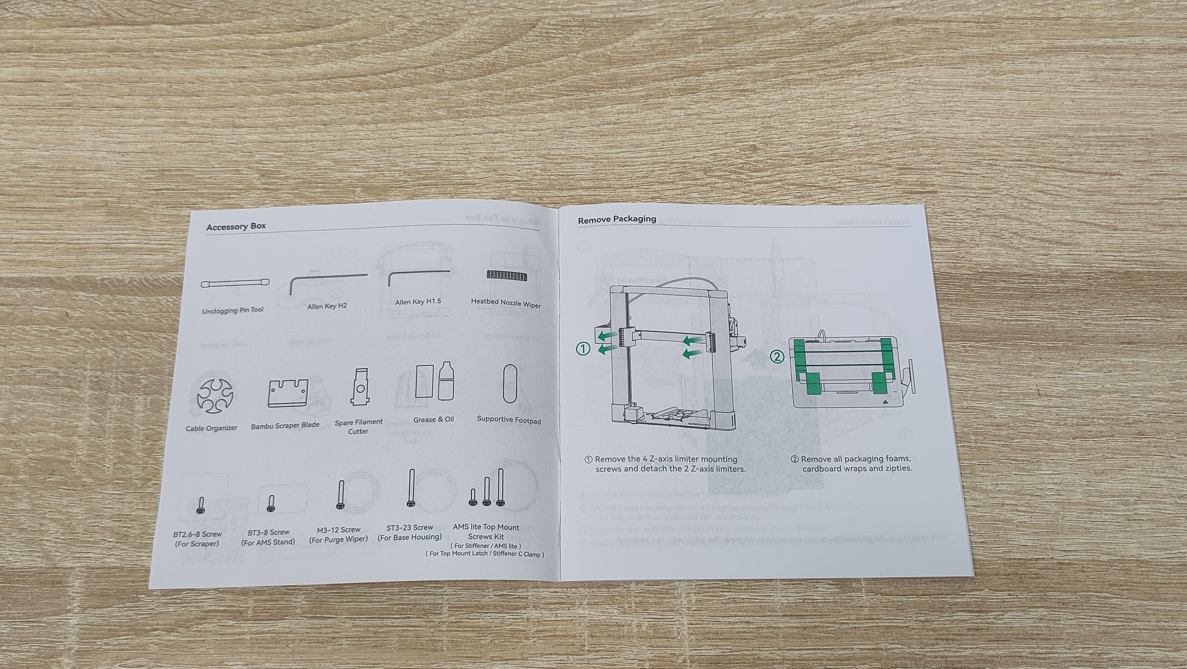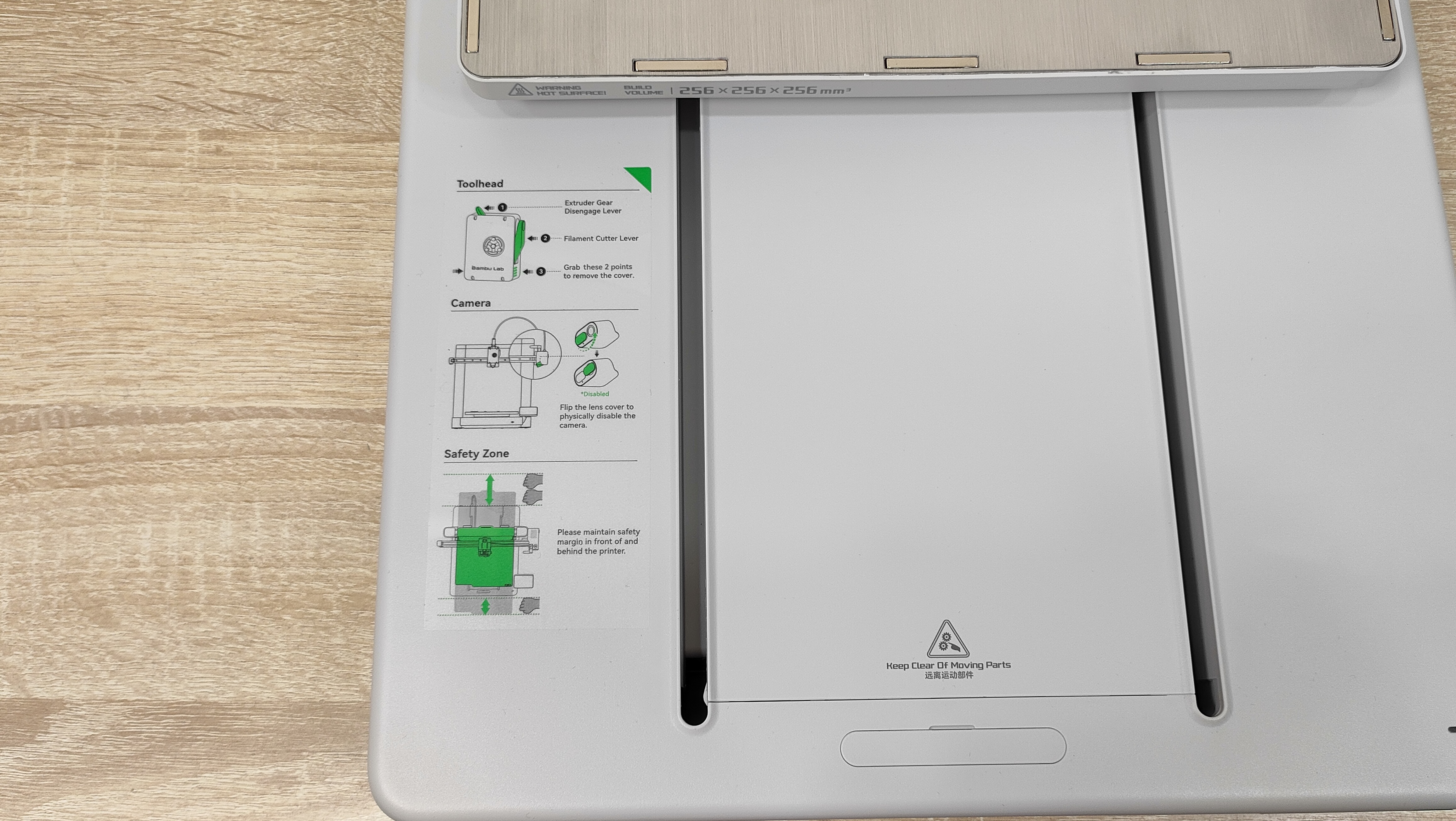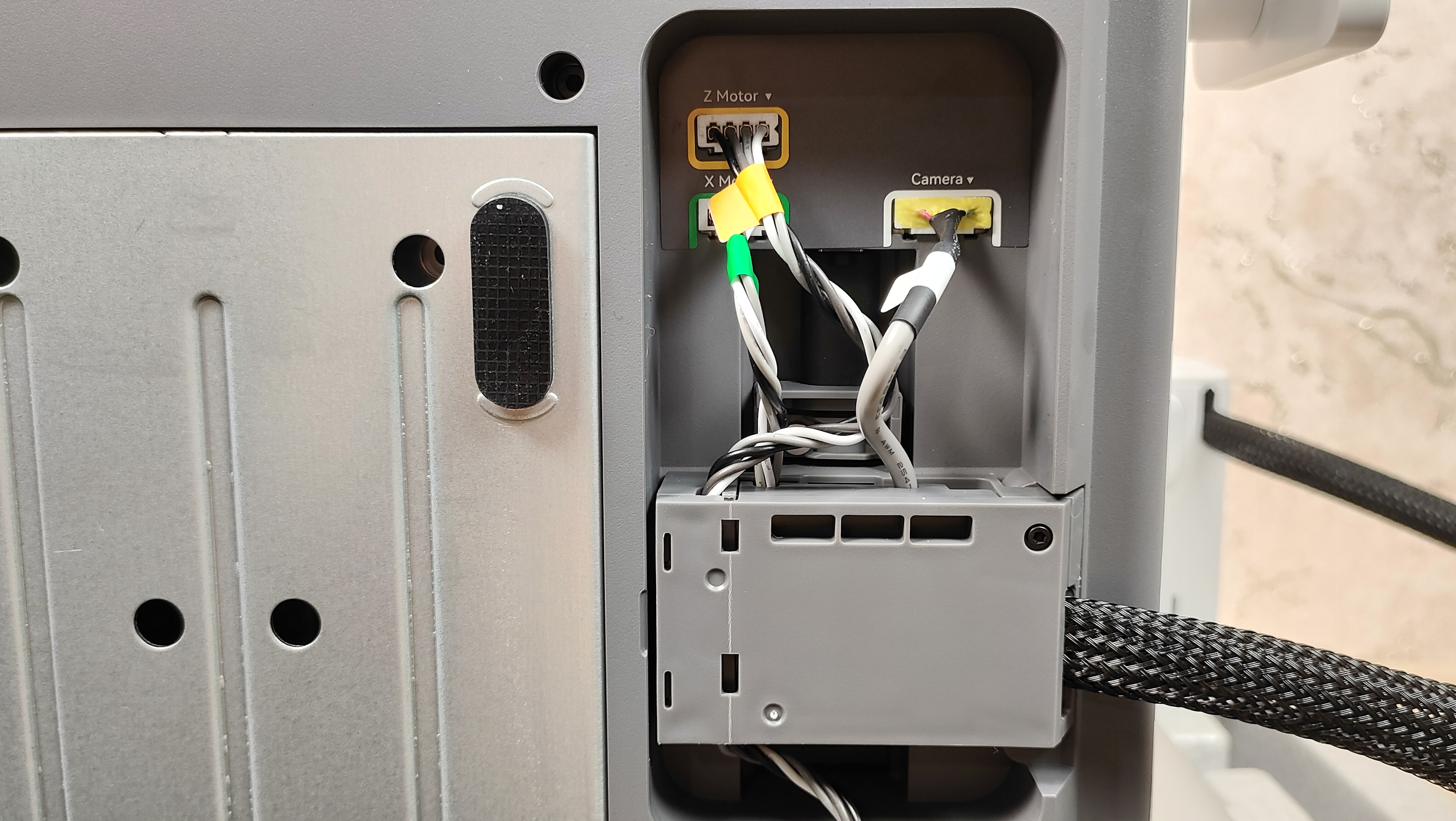 Первым пунктом идёт снятие транспортных защитных элементов с направляющей X, которая зафиксирована для избежания повреждений во время транспортировки. Экструдер уже установлен и собран, и не требует каких-то отдельных манипуляций. Уже на этом этапе видно, что у данного принтера практически всё готово к работе, осталось только крупноузловая сборка из двух частей, а также соединить провода. В экструдере установлено сопло 0,4 мм, а сверху, можно обратить внимание, что есть специальный хаб для филамента, где можно установить до 4 прутков. На блоке управления, кроме проводов, можно увидеть камеру для таймлапса и подсветку.
