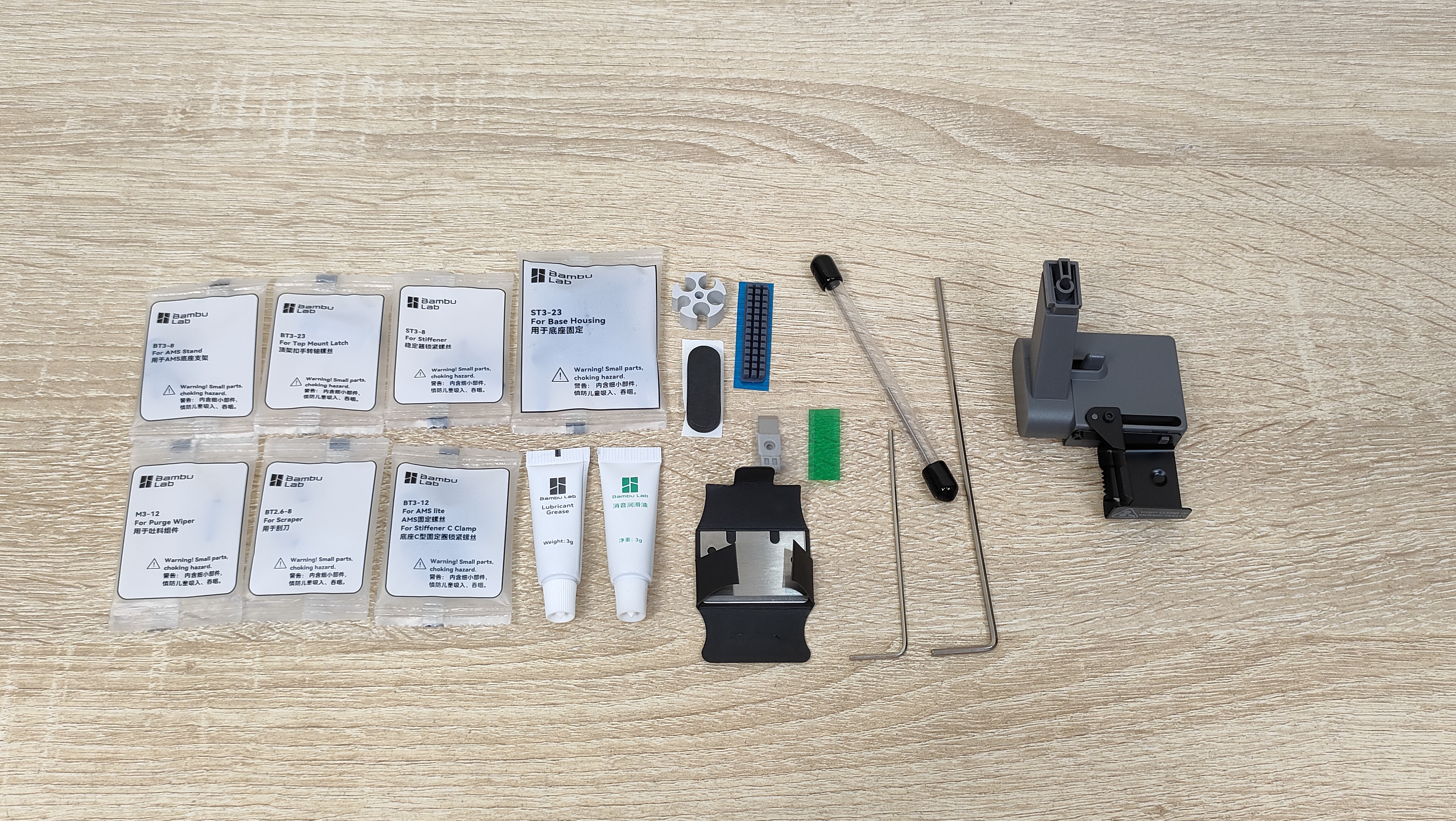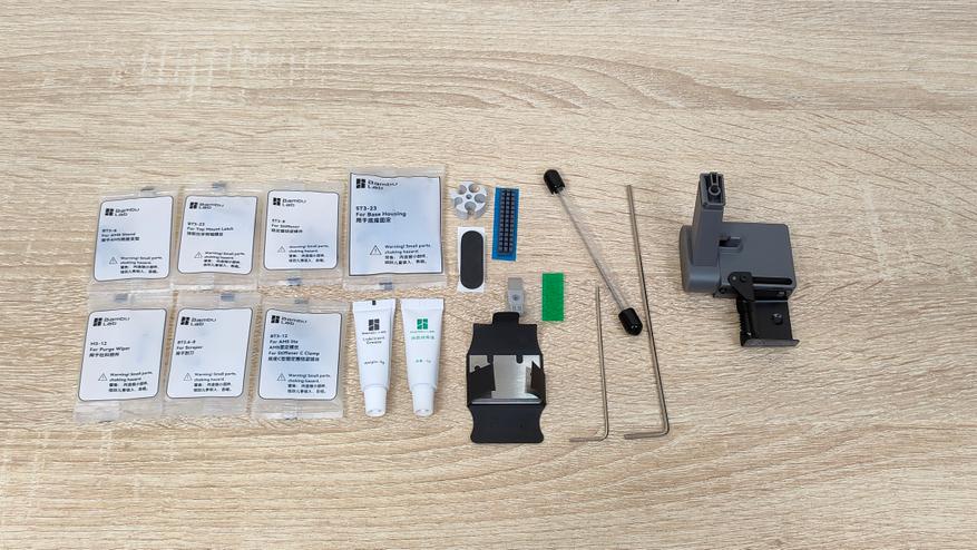 Во-первых, весь необходимый инструмент есть в наличии, то есть собрать принтер до готовности к включению можно без дополнительных средств. Во-вторых, в комплекте есть аксессуары для обслуживания: игла для чистки хотэнда, а также пара разных тюбиков для смазки. Кроме того, есть фирменные наклейки, почему бы и нет.