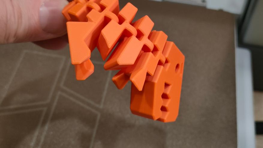 Маленький тестер распечатался нормально, за исключением опять же легенды, которую слайсер проглотил. Следующая пара моделек нужна для демонстрации того, как принтер печатает подвижные элементы.